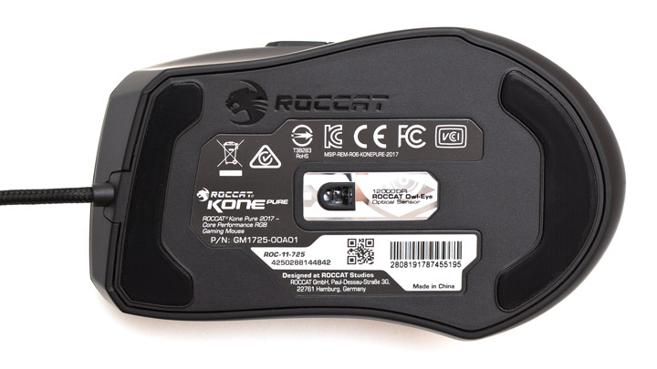 На основании мыши есть две фигурные тефлоновые ножки впереди и сзади. Оптический сенсор с инфракрасной подсветкой Owl-Eye (он же — Pixart 3361) располагается посередине, в окружении наклейки с серийным номером.