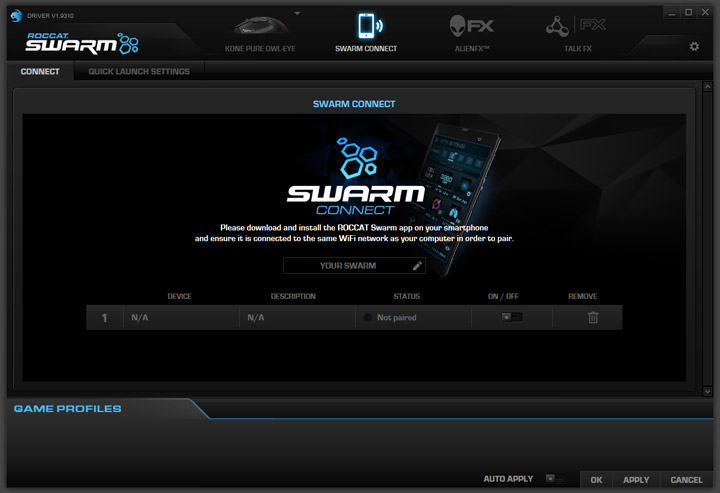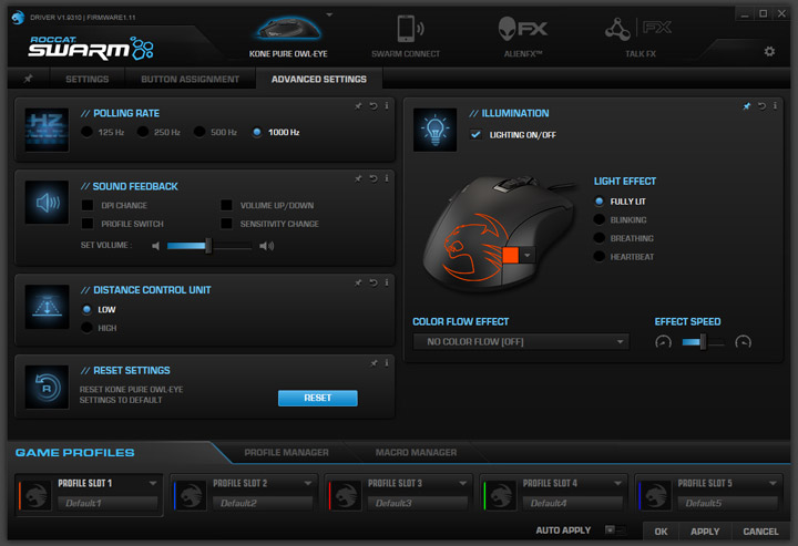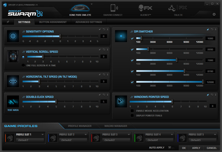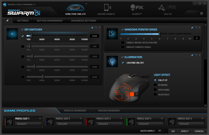 Универсальное программное обеспечение компании, которое поддерживает, в том числе, и мышь Kone Pure 2017, называется Roccat Swarm. В данном случае использовалась версия ПО 1.9310, и с ее установкой возникали проблемы. Из-за чего пришлось сделать откат на раннюю версию и уже обновиться с нее. Текущая прошивка мыши версии 1.11 была скачана и установлена автоматически без проблем. Главная страница ПО, которая встречает пользователя при загрузке, содержит наиболее часто используемые настройки. Чтобы вынести соответствующее окно на нее, необходимо нажать синий значок в виде канцелярской шпильки в правом верхнем углу. Вверху есть перечень доступных вкладок, а внизу — слоты с пятью профилями, которые можно сохранять во встроенной памяти манипулятора.