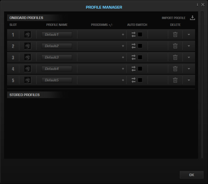 В Profile Manager хранятся все варианты профилей, которые пользователь создал для своей мыши. Пять профилей помещается в память мыши, остальное можно сохранить на будущее в памяти ПК. Поддерживается редактирование профилей, привязка их для автозапуска вместе с отдельными приложениями и автоматическое переключение.