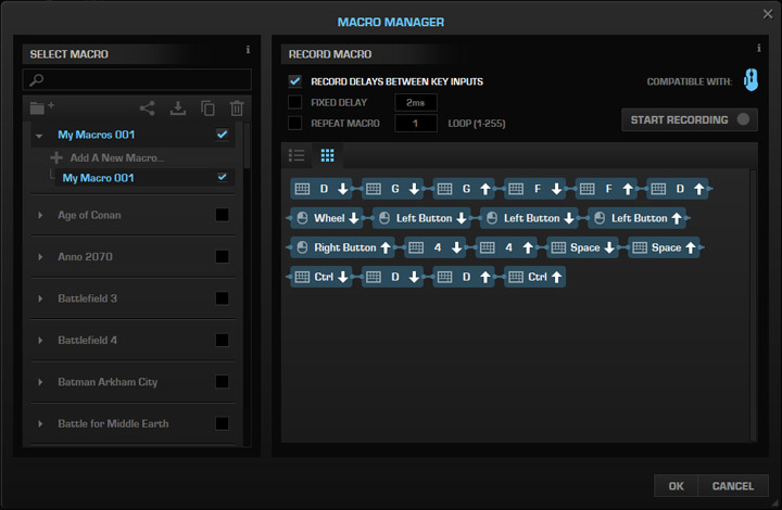 Редактор макросов содержит огромную библиотеку готовых макрокоманд почти для всех наиболее популярных современных игр. Но можно записать и свой вариант. Поддерживается ввод команд с мыши и клавиатуры и установка временных задержек. Запись позиции курсора мыши не поддерживается.