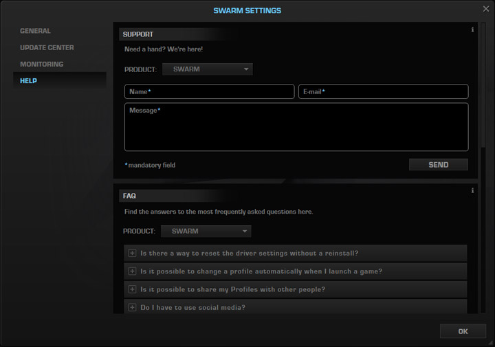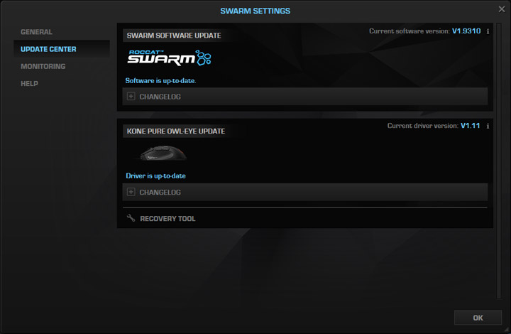 В Update center есть отчет о текущих версиях ПО и прошивки продукта, а так же Recovery Tool — откат до последней рабочей версии прошивки мыши.