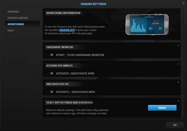 В разделе мониторинга можно выбрать параметры, которые будут отображены на дополнительном экране при подключении через Swarm Connect. В частности, это информация о текущем состоянии ПК, количестве нажатий в минуту и ошибочных нажатий. Статистику можно сбросить при желании.