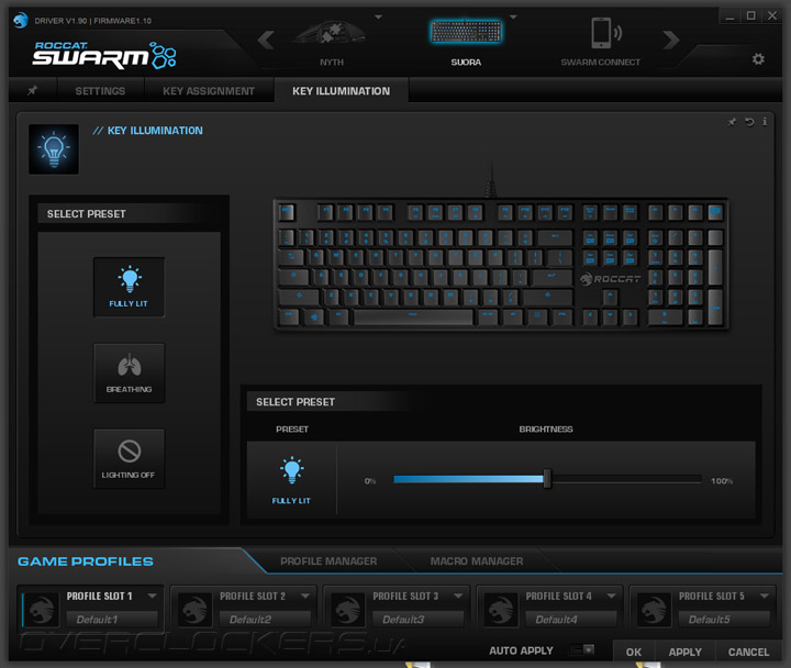 В качестве программного обеспечения Suora использует универсальный игровой драйвер Roccat Swarm версии 1.90 (текущая прошивка клавиатуры 1.10). Сразу после подключения клавиатуры к ПК, нам было предложено обновить ее прошивку. Приятно то, что данный драйвер позволяет вернуть последнюю рабочую версию прошивки устройства, если что-то пошло не так. Базовый экран, который встречает пользователя при старте ПО, выглядит пустым, но, на самом деле, на него можно вынести все необходимые настройки, закрепив их тут путем нажатия на иконку шпильки. В верхней части есть лента с выбором устройства, которое требуется настроить. Снизу находится пять профилей настройки на выбор. Изменения можно применять как вручную, так и автоматически, для чего есть соответствующий переключатель.