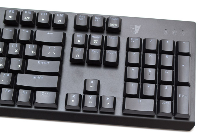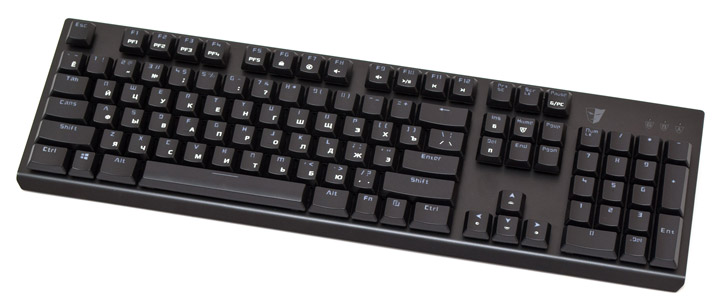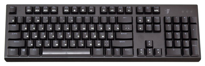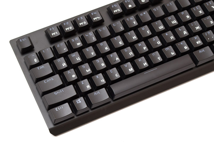 На клавиатуре присутствует английская и русская гравировка. Первая расположена сверху по центру и достаточно хорошо просвечивается встроенными светодиодами. Кириллица же нанесена с помощью блеклой краски в правой нижней части клавиш. Она неплохо считывается при свете дня, однако очень слабо различима в темноте. Данная экономия может основательно расстроить пользователей, не владеющих методом «слепой» печати. В целом раскладка клавиш абсолютно стандартная, левый и правый Shift удлиненные, F1 расположен ровно над цифрой «2», клавиша Win находится на своем законном месте. Ее традиционно можно заблокировать от срабатывания, путем разового нажатия в сочетании с Fn (разблокировка производится повторным нажатием данного сочетания). Комбинации кнопок (F1–F5)+Fn отведены по умолчанию под переключение профилей, сохраненных во встроенной памяти. F6+Fn блокирует все клавиши (функция замка от детей), а F7+Fn полностью заглушает звук.