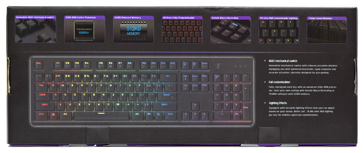 Упаковка клавиатуры выглядит достаточно информативно, копируя в основном содержание страницы официального сайта продукта. Описание основных достоинств и фотографии изделия в наличии. Защита от повреждений — два небольших демпфера по бокам и полиэтиленовый пакет.
