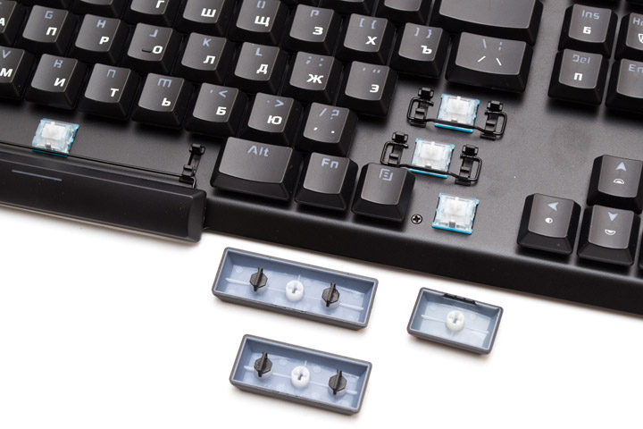 В качестве переключателей тут применяются механизмы от Kailh. Хотя формально их можно назвать клонами Cherry MX Bluе по тактильным ощущениям, по факту они похожи на них лишь отдаленно. Судя по всему, разрабатывалась данная система специально для Tesoro, которая присвоила им наименование Agile (подвижный). Корпус и штифт переключателей выполнен из прозрачного и белого пластика, на тип механизма указывает лишь его нижняя часть, которая слегка выступает над поверхностью. RGB светодиод установлен на дне корпуса переключателя. Основная часть его света проходит через верхнюю скошенную грань механизма. Характерный щелчок при нажатии совпадает с моментом активации кнопки, который происходит уже на 1,5 мм хода. До упора клавиша проходит еще 2 мм пути. Для сравнения — классические механизмы срабатывают на 2 мм, а суммарный пусть составляет 4 мм. Сброс защелки происходит почти в самом верху, потому после первого нажатия, если не отпускать колпачок до конца, то можно производить множество активаций переключателя практически беззвучно. Колпачки сделаны методом двойного литья и имеют высоту в 6,2 мм. Стандартные кнопки — 11,5 мм. Стабилизаторы на длинных кнопках проволочные, клавиши удерживают достаточно ровно. Судя по официальному сайту, на данный момент Tesoro Gram Spectrum доступна для покупки с двумя вариантами механизмов — кликающими тактильными Blue и линейными тихими Red.