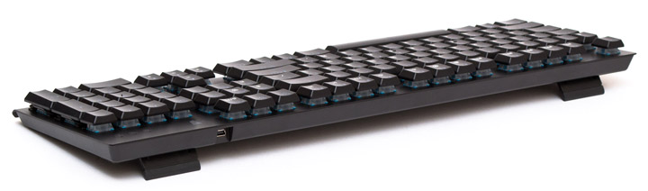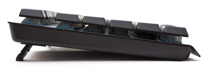 Колпачки клавиш имеют углубления посередине, но в профиль какие-либо наклоны отсутствуют. Если ножки сложены, кнопки находятся почти в параллельном положении относительно поверхности стола. А при развернутых ножках высота задней части клавиатуры увеличивается на 16 мм и она приобретает характерный наклон. Наклон потребуется в том случае, если пользователь сидит низко. Если он «нависает» над столом, то удобнее будет пользоваться устройством со сложенными ножками, чтобы не было сильных перегибов кистевого сустава.