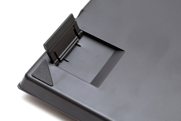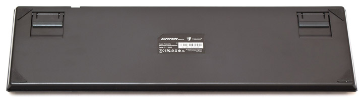 Дно и небольшие боковины клавиатуры сделаны из матового пластика. По углам корпуса есть четыре треугольные резиновые ножки, по центру наклейка с серийным номером продукта. Крепежные винты с этой стороны отсутствуют — они все утоплены в верхнюю панель и скрываются под клавишами.