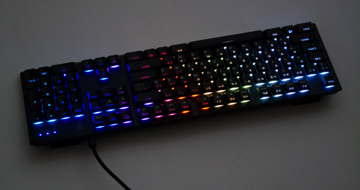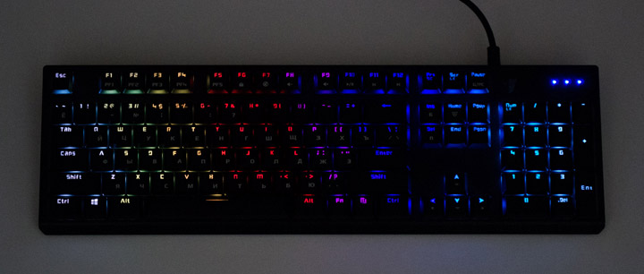 Все кнопки на клавиатуре поддерживают RGB-подсветку, и могут быть настроены на какой угодно цвет или отключены. Подсвечивается только латинская раскладка, кириллица в темноте различима слабо. Палитра цветов выглядит естественно ближе к правой части спектра (фиолетовому, зеленому, синему цветам). Белый, красный и желтый оттенки отображаются некорректно. Паразитный засвет между кнопками незначительный. Его можно свести на нет уменьшением яркости (доступно четыре уровня и возможность полного отключения подсветки).
