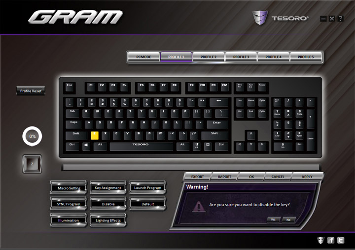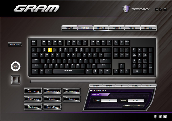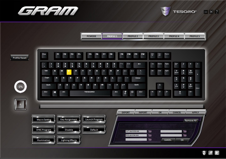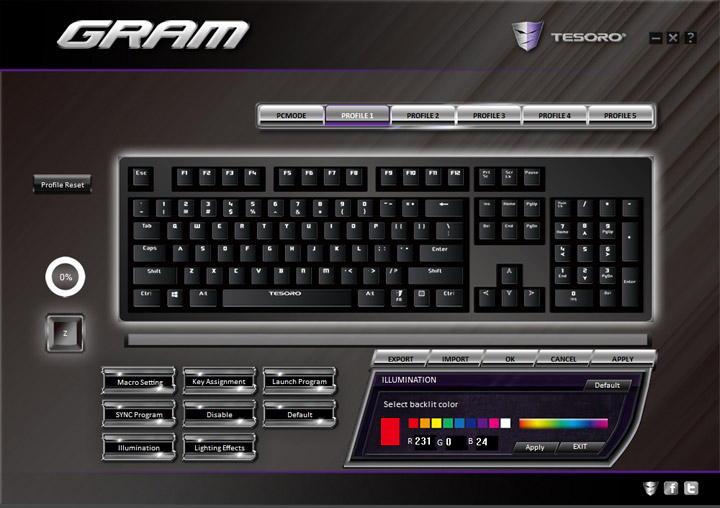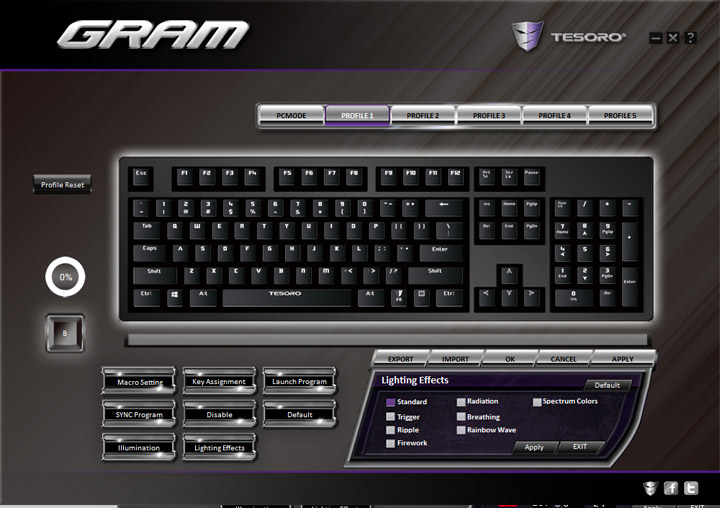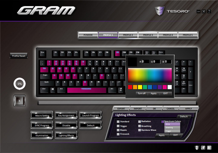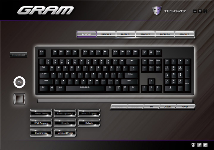 В качестве программного обеспечения Tesoro Gram Spectrum использует индивидуальный драйвер версии 1.92 от 03.01.2017. Последняя актуальная версия прошивки обозначена номером 3540 и датируется 25.12.2015. ПО не имеет русской локализации. После установки, программа прописывается в автозапуске и загружается при каждом старте системы. Возможности отключить ее автоматический старт нет, что довольно странно, ведь бортовая память клавиатуры отлично сохраняет все настройки в пяти доступных профилях. Базовый экран драйвера с изображением клавиатуры является основным для всех функций, изменения происходят в нем лишь в нижнем правом углу. Шесть верхних вкладок позволяют мгновенно переключать профили устройства (что можно делать и аппаратно, нажимая сочетания Fn+(F1–F5) и Fn+Pause. Профиль PC Mode является настройкой по умолчанию. Он не предусматривает возможности переназначения команд, однако поддерживает настройку подсветки и привязку к работе тех или иных программ.