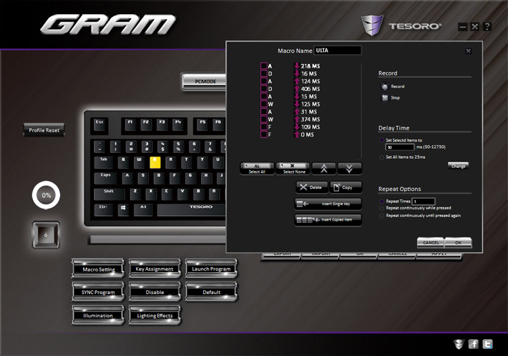 Для кнопок можно записать и переназначить макрос. Окно макроредактора позволяет записать команду, отредактировать ее порядок и временные задержки. Интересно, что выставить нулевую задержку не выйдет. Исполняются лишь прерывания длиной в 25 мс, либо в диапазоне от 50 до 12750 мс. Сами макросы отдельно нигде не сохраняются. Название исполняемой команды будет отображаться в строке под изображением клавиатуры, когда соответствующая кнопка выделена желтым цветом. Белый кружок с процентами слева посередине отображает степень наполненности внутренней памяти. Длина макросов по факту ограничена лишь ее доступным объемом.