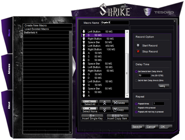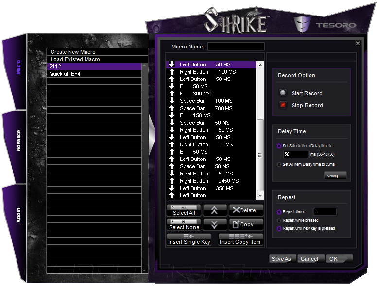 Запись макросов производится в отдельной вкладке Macro. Редактор допускает изменение последовательности комбинаций, выбор времени задержки, цикличность воспроизведения и т.д.