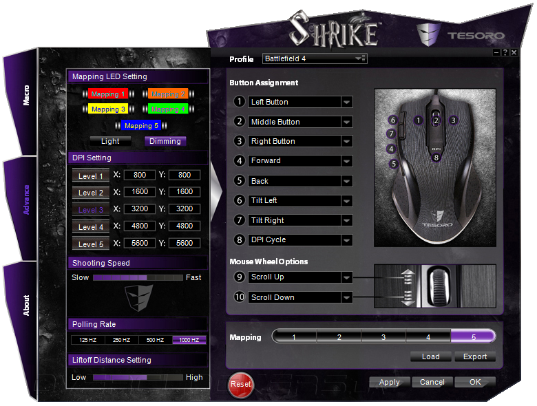 На следующей вкладке Advance регулируются параметры работы лазерного сенсора. Значения пяти уровней чувствительности выставляются раздельно по осям X и Y. При всём этом нельзя выбрать разрешение за границами пределов 400/800/1600/2400/3200/4000/4800/5600 dpi. Дополнительно настраивается цвет подсветки в пяти режимах, скорость нажатий, высота отрыва от поверхности (Lift off Distance) и частота опроса USB порта в промежутке от 125 до 1000 Гц.
