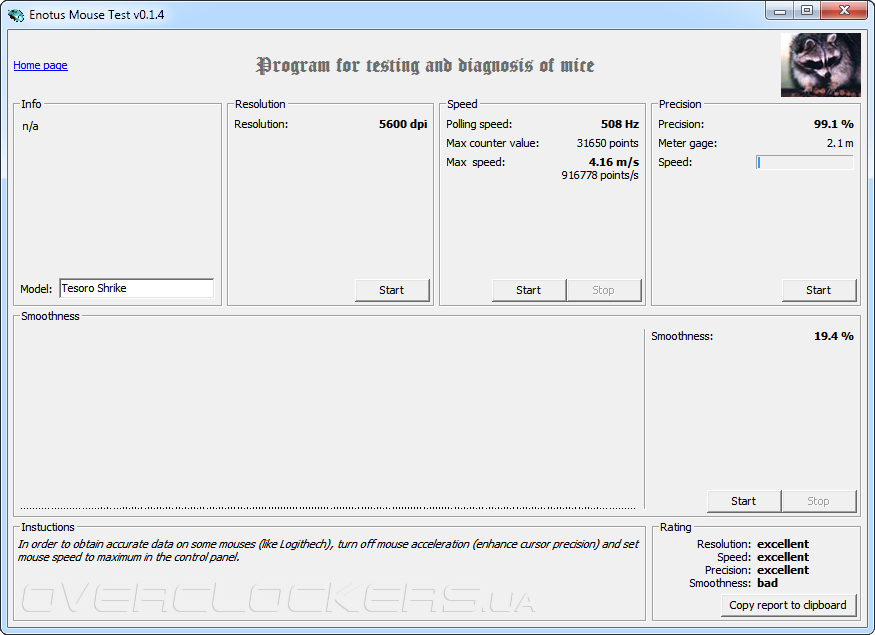 Программа по диагностике манипуляторов Enotus Mouse Test (версии 0.1.4) зафиксировала следующие значения работы сенсора Avago ADNS-9500 на коврике SteelSeries QcK.