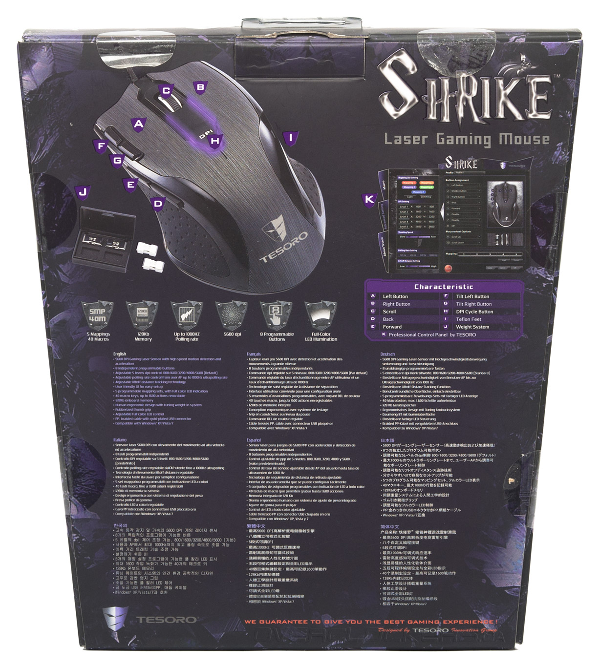 На обратной стороне показано графическое изображение мыши с нумерацией всех элементов управления, скриншоты окон программного обеспечения, логотипы, перечень подробных технических характеристик, системные требования и описание на нескольких языках.