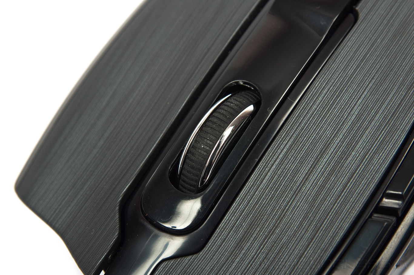 Колесо прокрутки на удивление узкое. В общей сложности его ширина равна 5,8 мм. Сперва посчитал, что основа скролла сделана из пластика, окрашенного под металлик. Однако спустя пару часов работы с манипулятором стало ясно что это металл. Внешняя его часть закрыта тонким слоем резины. Сегментированные деления на протекторе упрощают контроль скорости прокрутки. Переходы между позициями ощущаются даже на высокой скорости. Плотная фиксация скрола положительно отобразилась на плавности его оборотов. Никаких посторонних звуков или надоедливого треска не слышно. Невзирая на отсутствие боковых нажатий, при вертикальном давлении скролл играет роль опциональной кнопки.