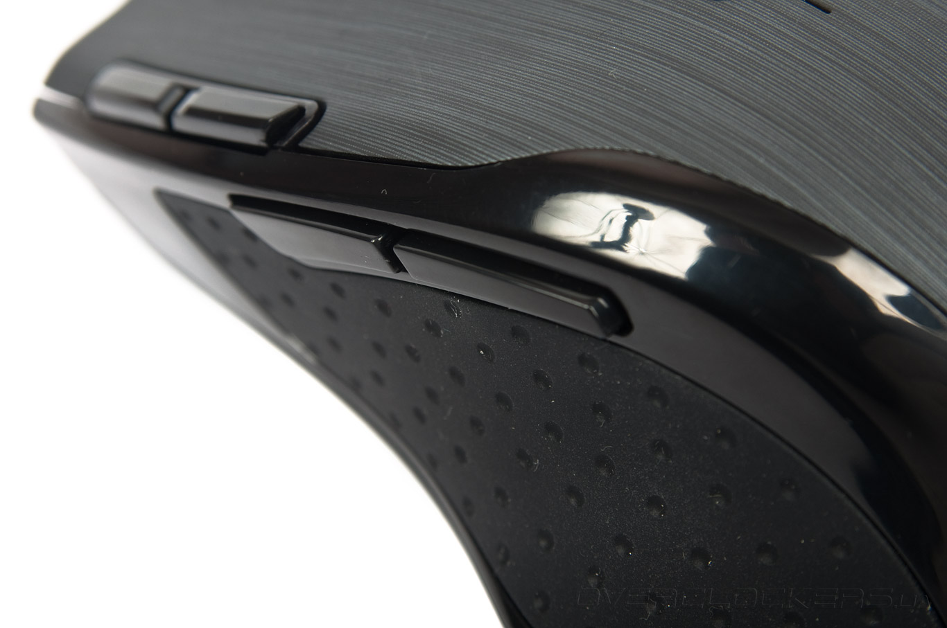 Наличие прорезиненных вставок в области боковин уже мало кого удивляет, тем более как показывает практика, идея такого подхода привносит практическую пользу. Материал точь в точь похож на прорезиненные панели популярных в прошлом манипуляторов Logitech серии MX Revolution и совершенно несравнимым с прорезиненными накладками игровых мышей Mad Catz, Razer, SteelSeries и т.д. Мягкие вставки имеют перфорированную текстуру и гарантируют хорошее сцепление с ладонью. Наравне с этим, они доставляют приятные ощущения в процессе работы.