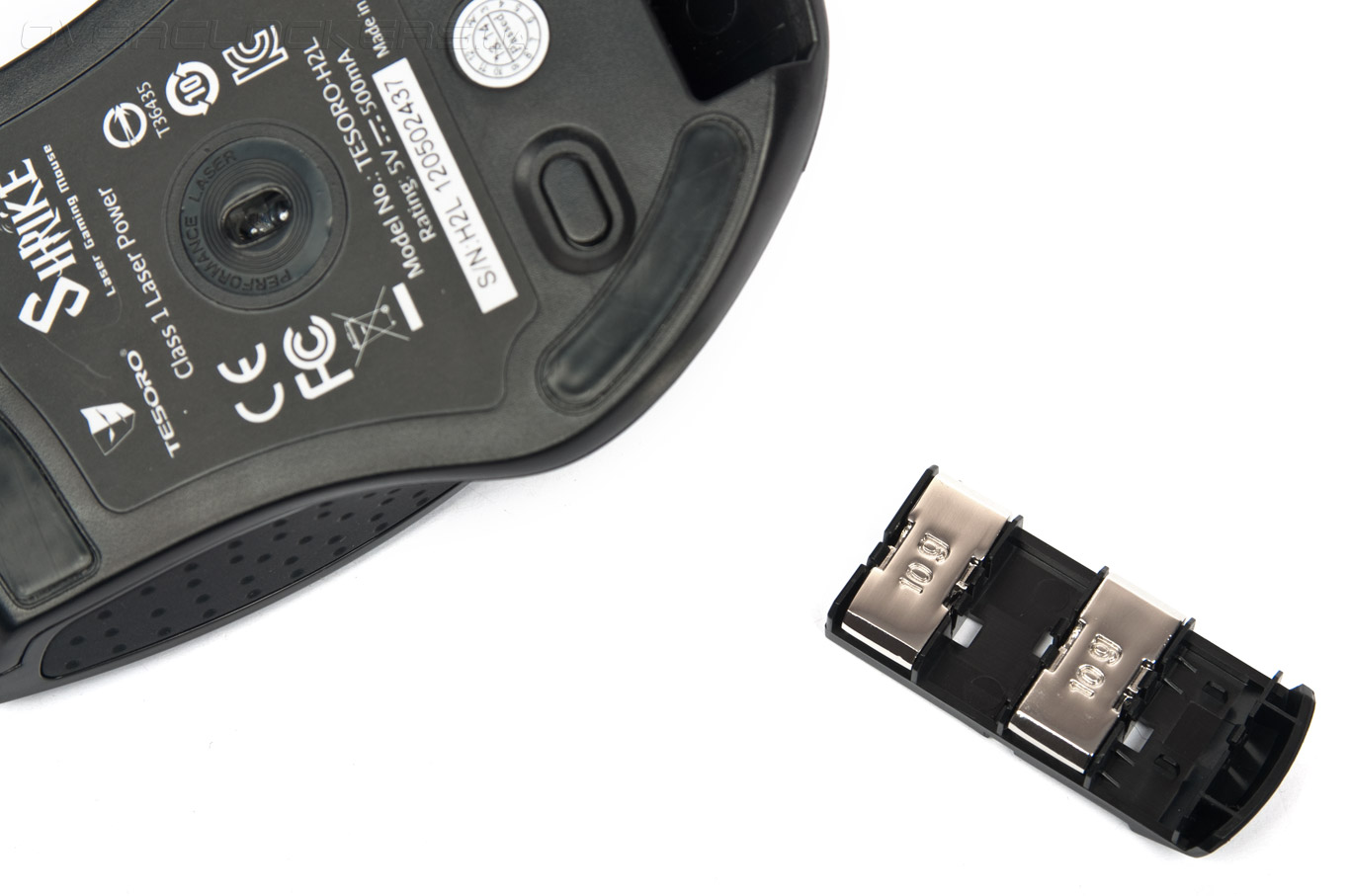 Вторым шагом в настройке Tesoro Shrike H2L стал подбор массы и центра тяжести. Без установленных утяжелителей, мышь довольно легкая. Её масса равна 100 гр. Благодаря системе регулировки веса пользователь может быстро увеличить её на 35 г. Вместе с комплектом поставки предоставляются четыре металлических грузика, аккуратно сложенных в компактный контейнер. Три из них весят 10 г, а один — 5 г.