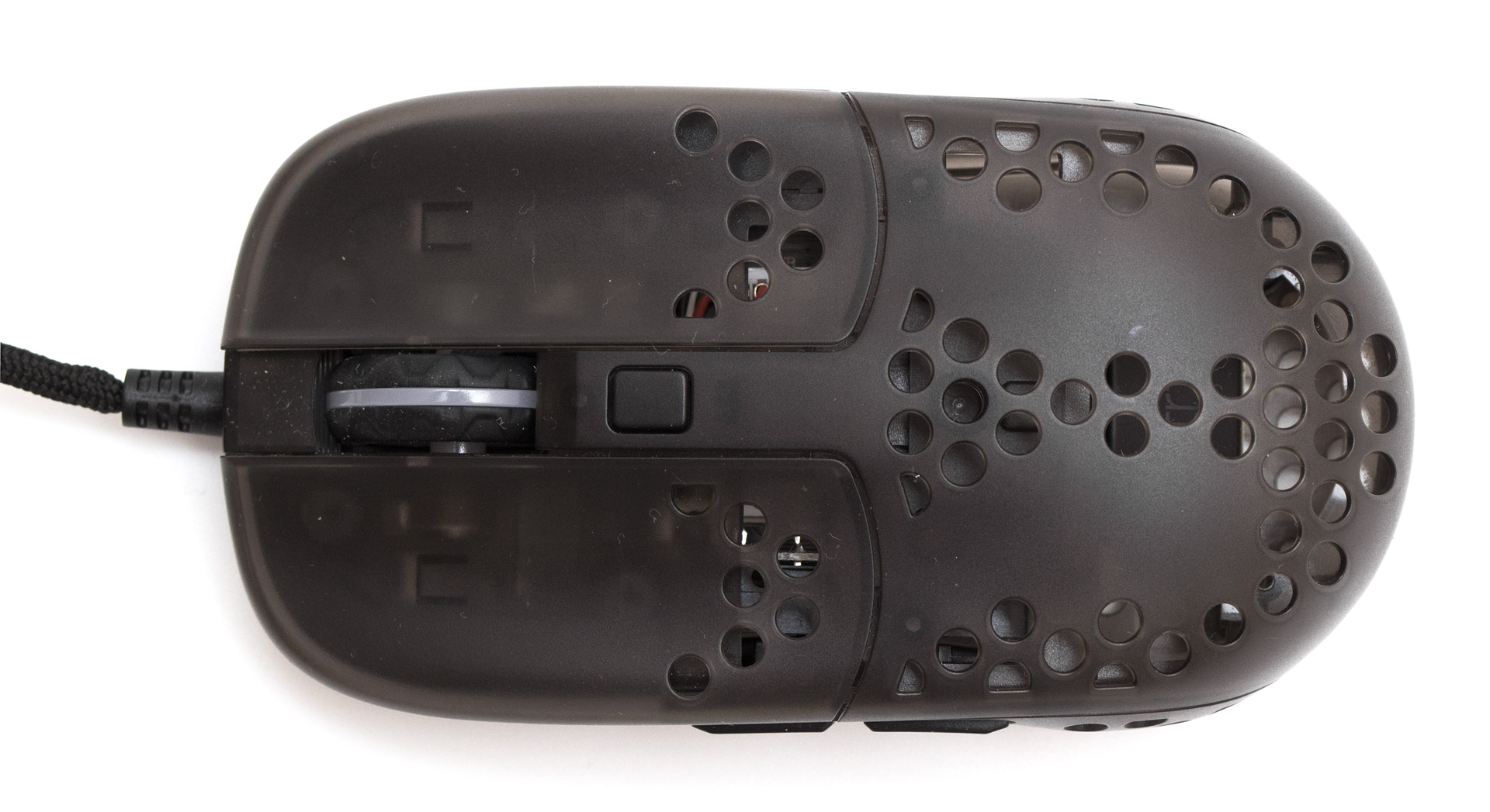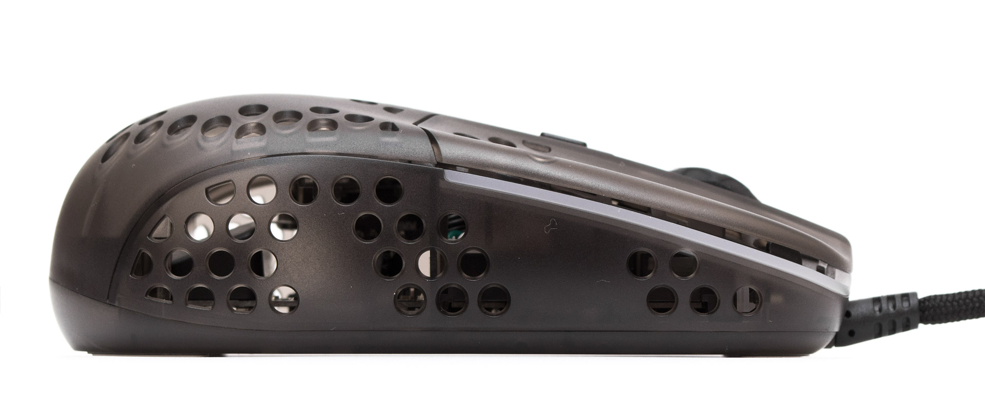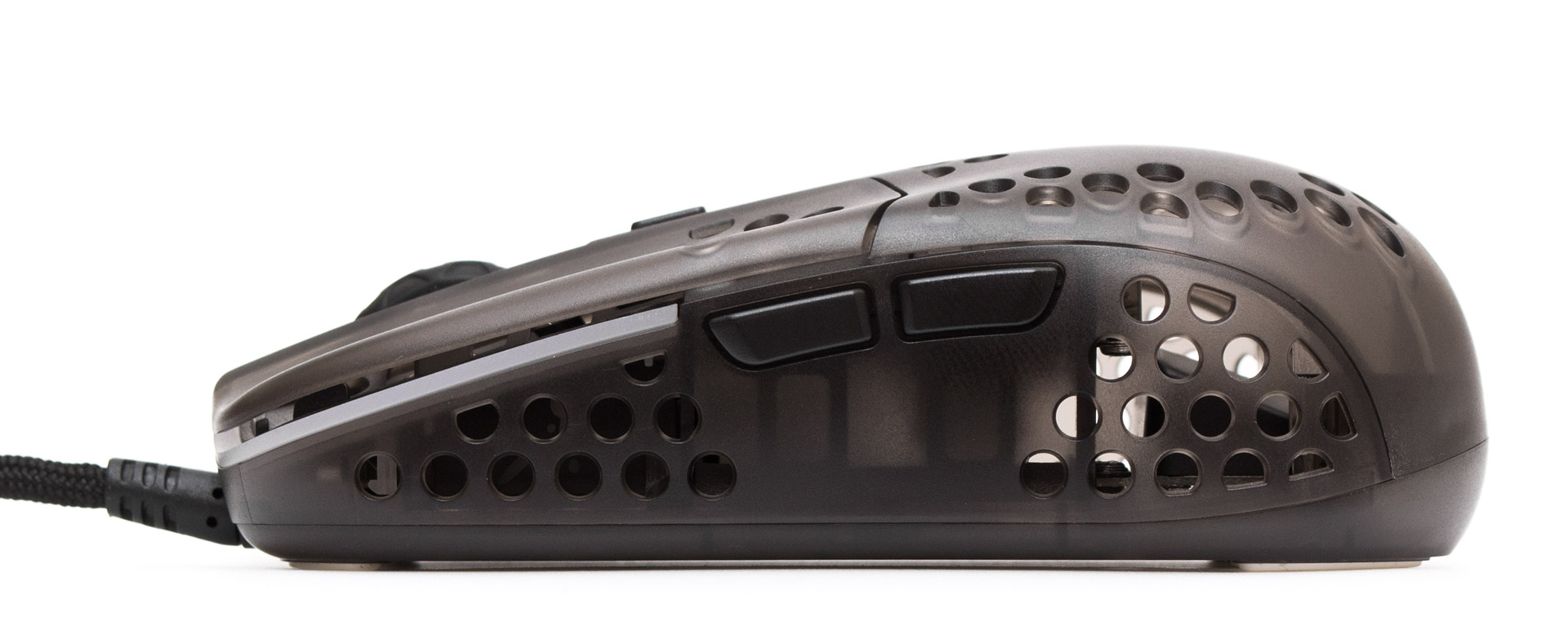 Xtrfy MZ1 выглядит и ощущается крайне необычно. Сверху она смотрится как обычная симметрия, напоминающая облизанный морской водой галечный камень. Но, по факту, это отход от каноничной «формы» капли видом в профиль. Корма в самой задней части резко задрана вверх и обрывается в том месте, где у других манипуляторов только начинается плавный изгиб. От задней до передней части мыши высота корпуса снижается под острым углом, а в панелях основных клавиш сделаны хорошо ощутимые углубления. Дополняется это все дымчатым полупрозрачным пластиком, пронизанным скругленными отверстиями. Поверхность тут матовая и цепкая на ощупь. Панели ЛКМ и ПКМ отдельные, они имеют небольшой горизонтальный люфт и неподвижно сидят по вертикали. Нажимаются с громким отчетливым щелчком, требующим среднего усилия для активации. Причем нажать кнопку можно почти в любом месте панели, не считая самой задней её части. В качестве основных переключателей здесь стоят Kailh GM 8.0 в полупрозрачном корпусе с черными кнопками. За колесом прокрутки встроена маленькая квадратная кнопочка, по умолчанию настроенная как функциональный переключатель для настройки разных параметров мыши в сочетании с другими клавишами. Нажимается туго и тихо, с едва различимым щелчком.