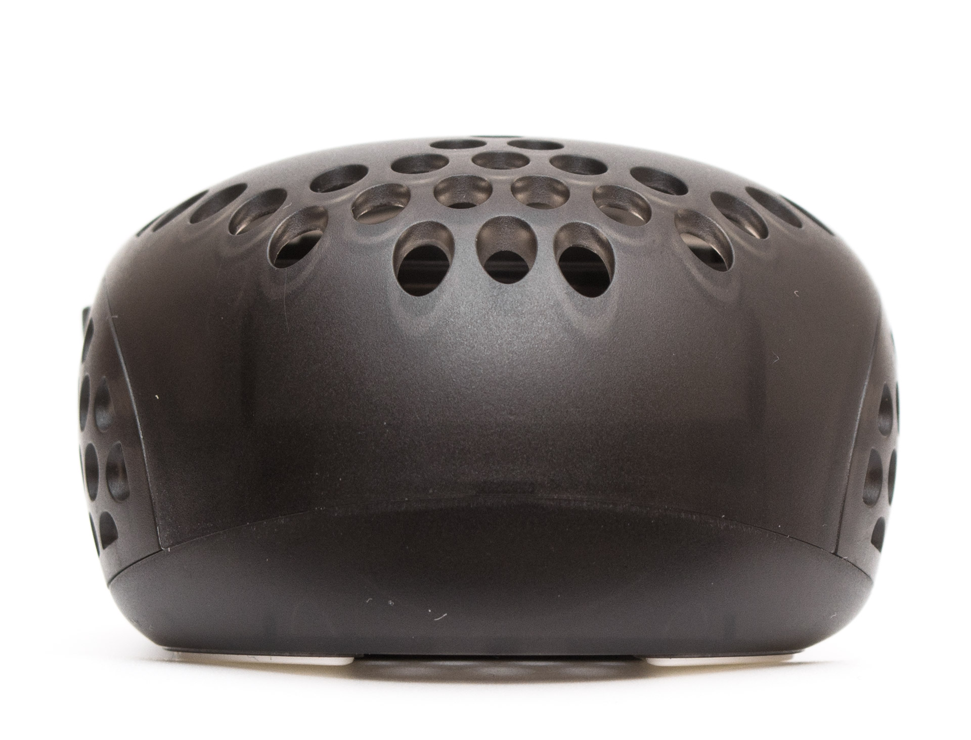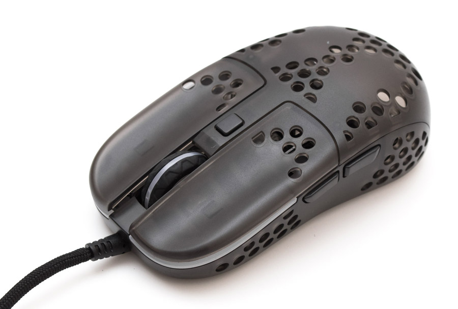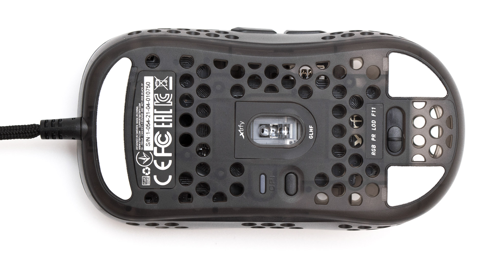 Xtrfy MZ1 выглядит и ощущается крайне необычно. Сверху она смотрится как обычная симметрия, напоминающая облизанный морской водой галечный камень. Но, по факту, это отход от каноничной «формы» капли видом в профиль. Корма в самой задней части резко задрана вверх и обрывается в том месте, где у других манипуляторов только начинается плавный изгиб. От задней до передней части мыши высота корпуса снижается под острым углом, а в панелях основных клавиш сделаны хорошо ощутимые углубления. Дополняется это все дымчатым полупрозрачным пластиком, пронизанным скругленными отверстиями. Поверхность тут матовая и цепкая на ощупь. Панели ЛКМ и ПКМ отдельные, они имеют небольшой горизонтальный люфт и неподвижно сидят по вертикали. Нажимаются с громким отчетливым щелчком, требующим среднего усилия для активации. Причем нажать кнопку можно почти в любом месте панели, не считая самой задней её части. В качестве основных переключателей здесь стоят Kailh GM 8.0 в полупрозрачном корпусе с черными кнопками. За колесом прокрутки встроена маленькая квадратная кнопочка, по умолчанию настроенная как функциональный переключатель для настройки разных параметров мыши в сочетании с другими клавишами. Нажимается туго и тихо, с едва различимым щелчком.