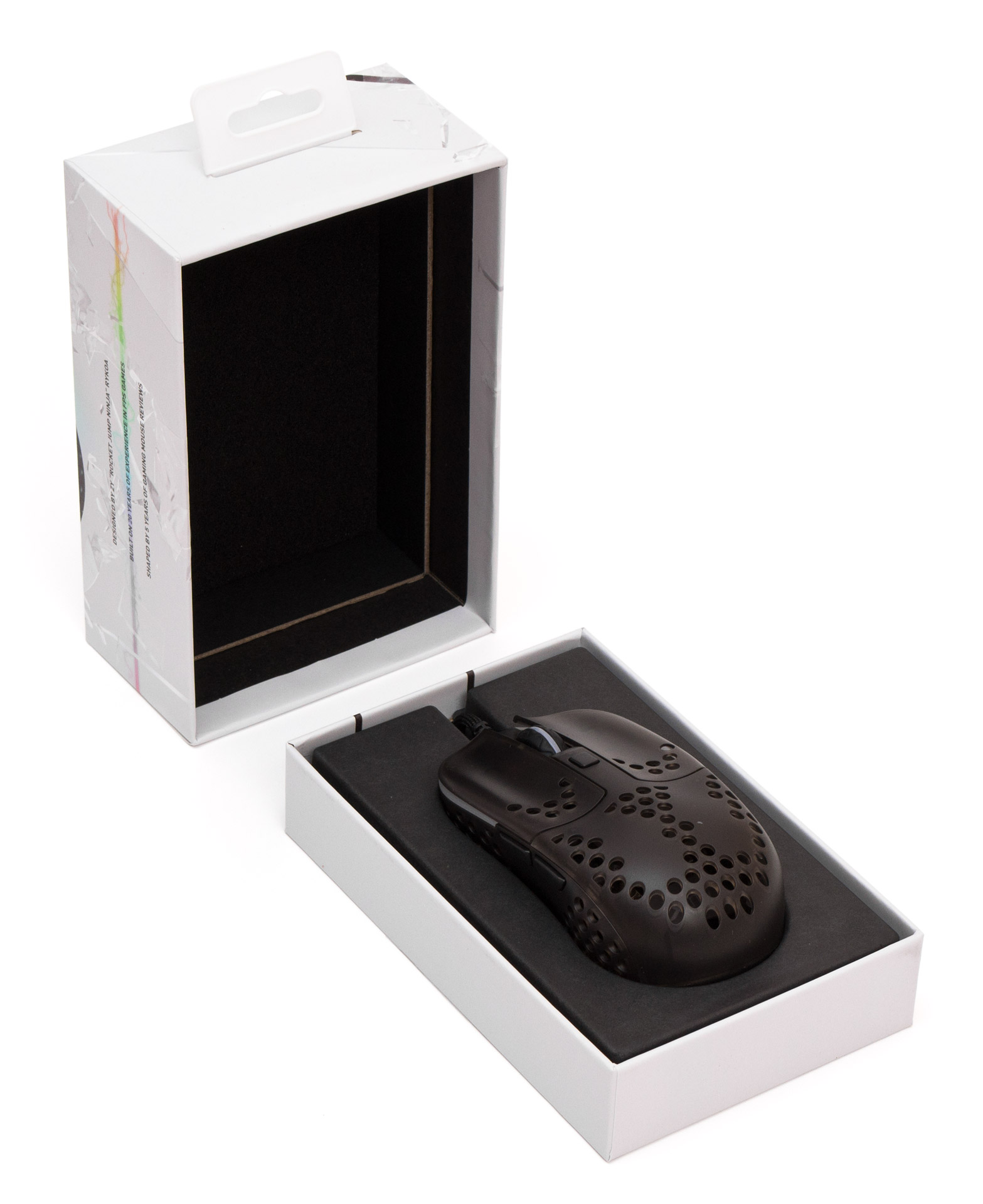 Коробка держится вместе на двух наклейках и легко разъединяется пополам. В нижней половине, на черном картонном пьедестале лежит сама мышь.