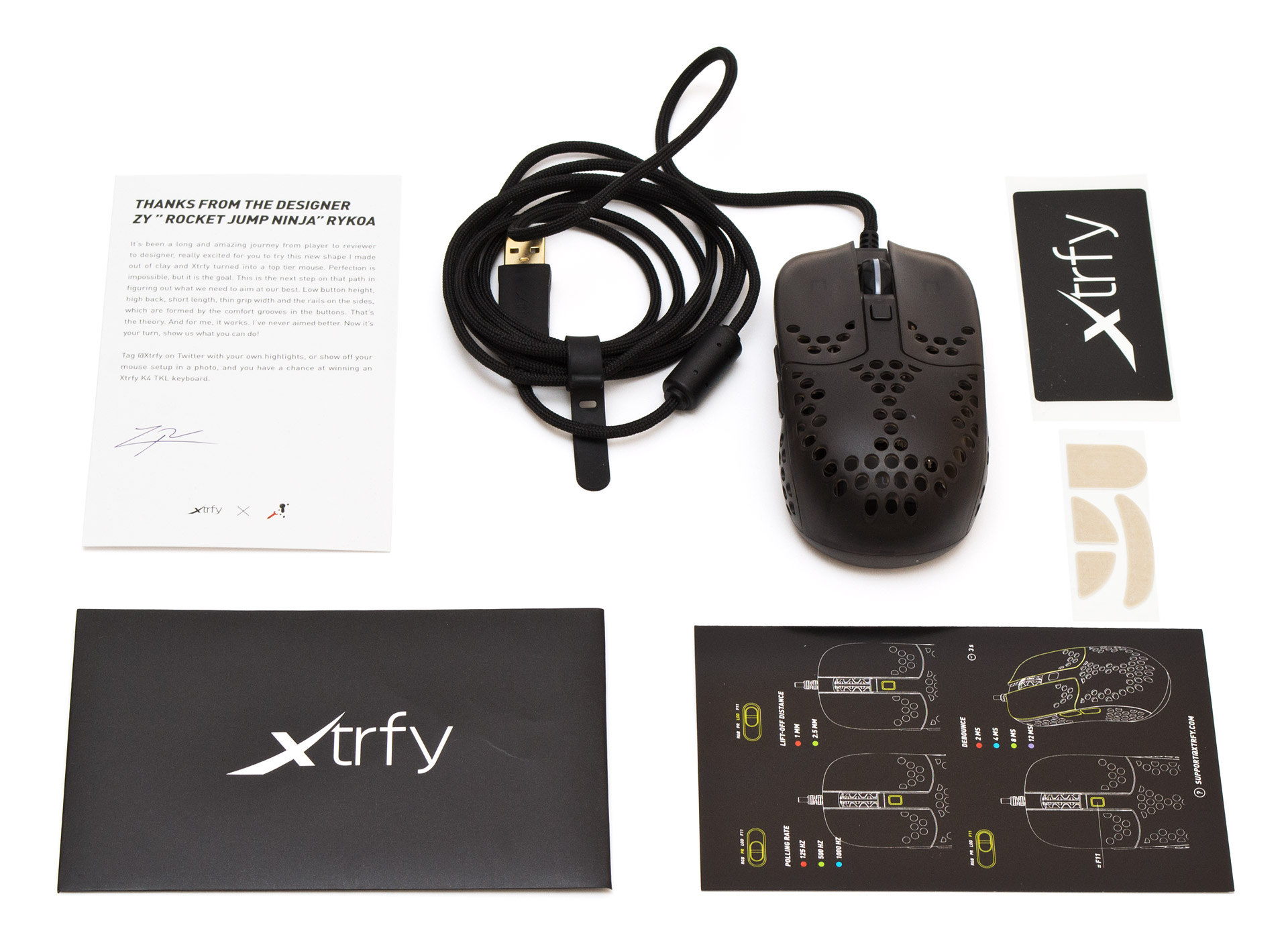 Помимо мыши, в комплекте поставки есть черный конвертик с логотипом Xtrfy, в котором находится лист с приветствием от разработчика, короткая инструкция по использованию, наклейка с логотипом Xtrfy и набор запасных ножек.