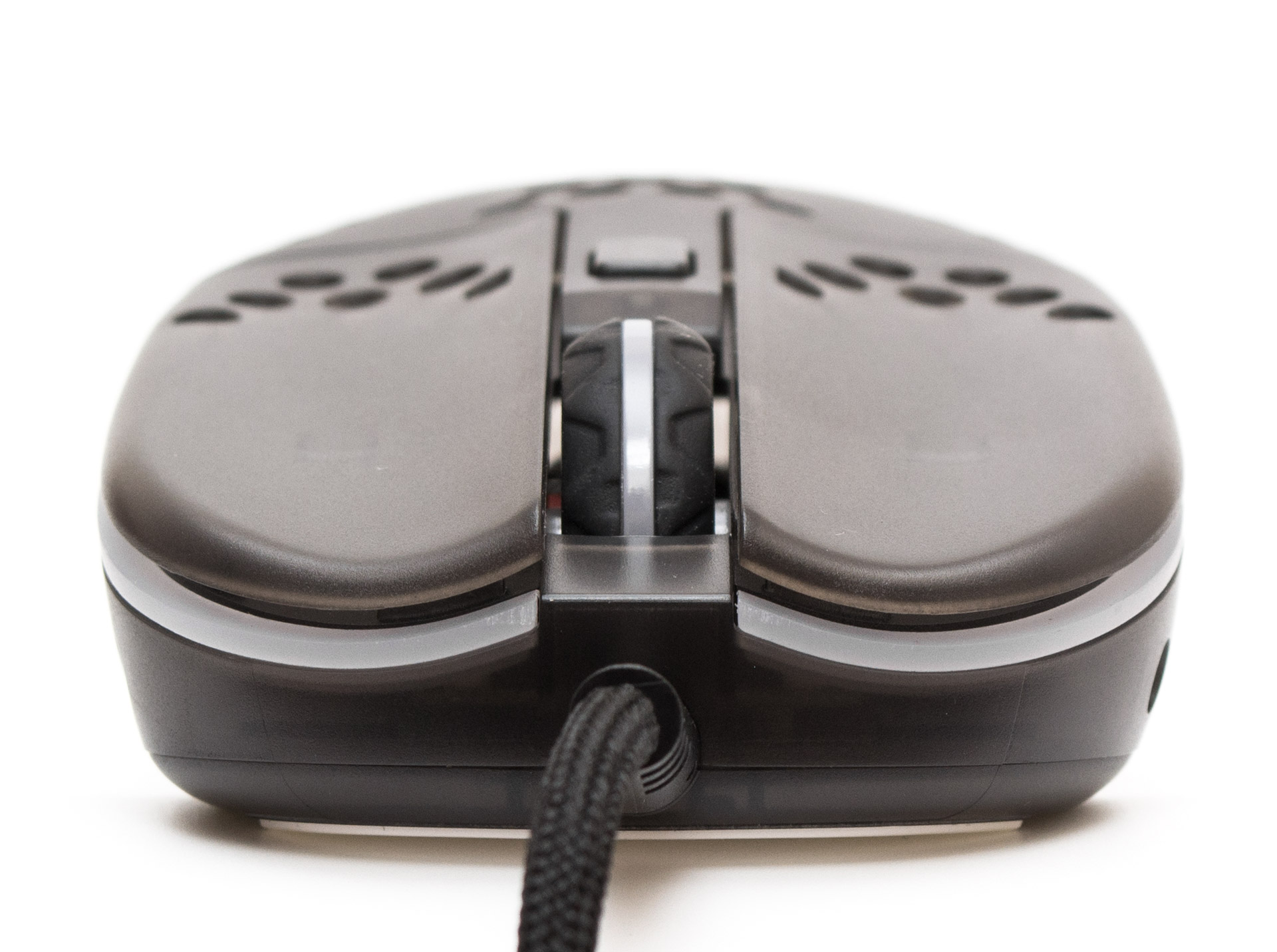 Сигнальный шнур заходит в корпус в его центральной части. Защита от перегиба длиной в 12 мм задрана вверх, чтобы гарантировать отсутствие трения между кабелем и поверхностью. Колесо прокрутки прорезинено по бокам и имеет пластиковую вставку для подсветки в центре. Оно очень тихое и легкое. Позиции фиксации четко отрабатываются тактильно, хотя звуков при этом нет. Едва различимый треск есть при прокрутке вверх. Энкодер здесь установлен от F-Switch. Средняя кнопка нажимается с усилием выше среднего, звук при этом получается глухой, но достаточно громкий. Нажатие происходит традиционно — перекосом в правую сторону.