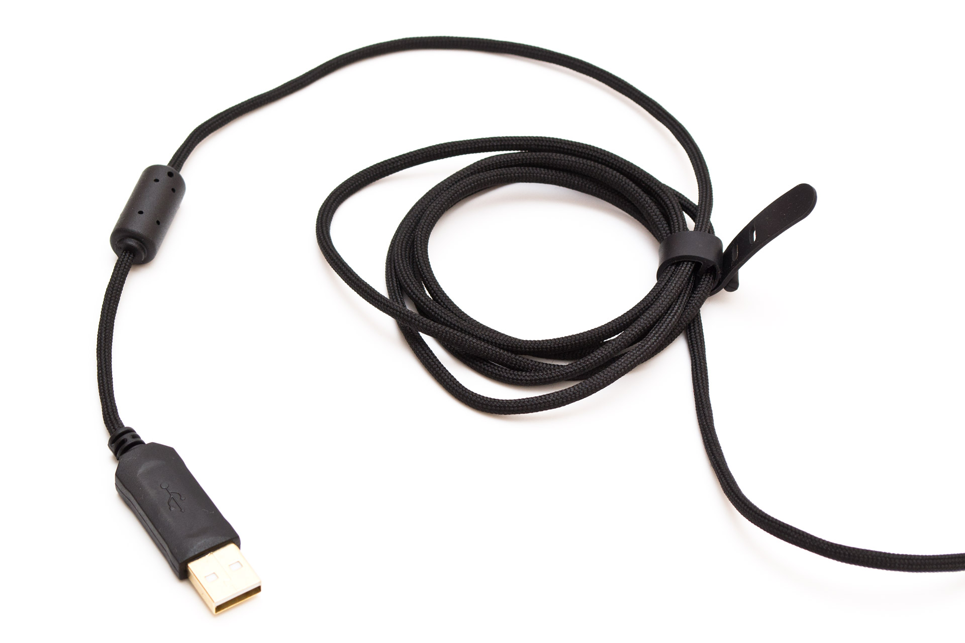 Мягкий и гибкий кабель длиной в 1,8 метра обернут нейлоновой оплеткой. У него даже есть собственное маркетинговое название — Xtrfy EZcord Pro. Шнур никак не мешает движениям мыши и его можно использовать без держателя. Для регулировки длины есть многоразовая резиновая стяжка. Ферритовое кольцо для устранения помех расположено недалеко от USB разъема.