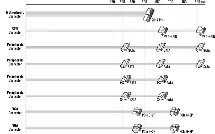Все кабели выполнены в виде шлейфов с черной изоляцией, кабели довольно жёсткие могут быть проблемы с укладкой в компактные корпуса. Их длина довольно большая, должно хватать для корпусов с нижним расположением блока питания.