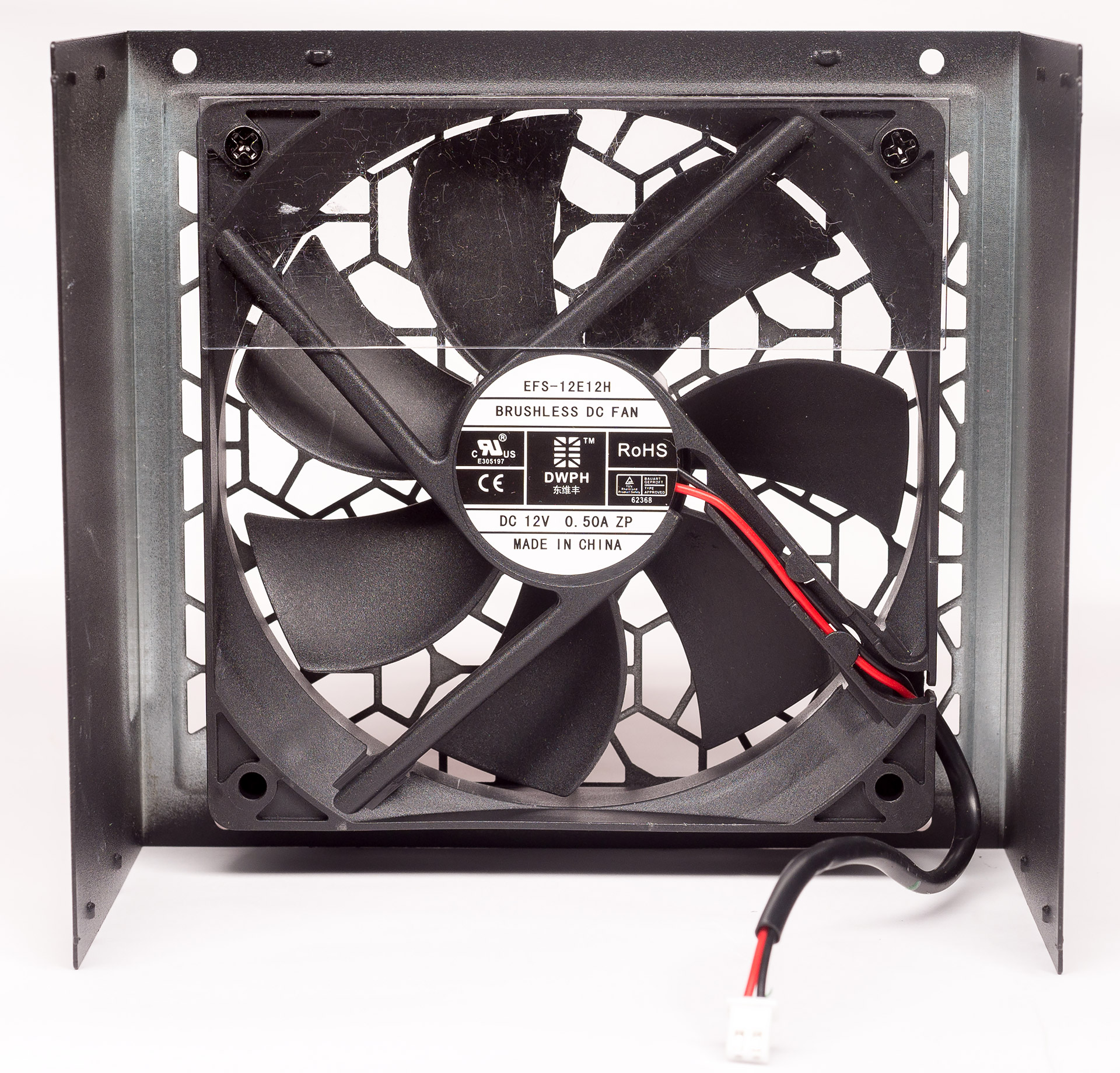 За охлаждение компонентов отвечает вентилятор типоразмером 120х120х25 мм с маркировкой EFS-12E12H производства DWPH с двухконтактным подключением. Вентилятор управляется автоматически в зависимости от температуры радиатора выпрямителя по линии +12 В. При старте блока вентилятор работал на 625 оборотах в минуту и почти не шумел, с ростом температуры должен плавно увеличивать скорость до 1800 об/мин.