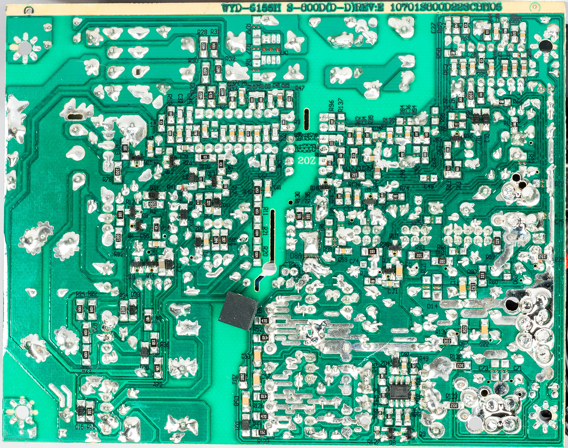 Монтаж удовлетворительный, некоторые компоненты установлены неровно, диодный мост не прижат к радиатору, хотя сама пайка качественная и плата нормально отмыта от флюса.