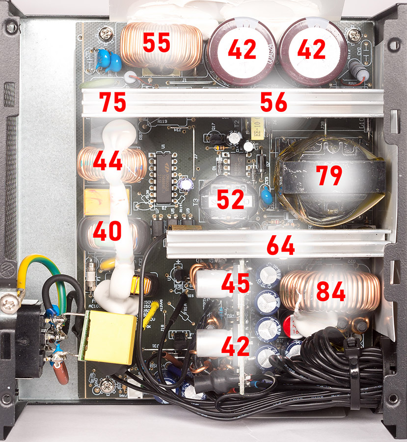 Пара силовых транзисторов PTA20N50A (20 А, 500 В) установлена на общий радиатор с элементами APFC. Выпрямитель линии +12 В синхронный и выполнен на четырех транзисторах AP9992GP (180 А, 60 В, 2,99 мОм), которые установлены на отдельный радиатор. Конденсаторы выходного фильтра: два полимерных емкостью 470 мкФ под напряжение 16 В от NJcon и пара электролитических конденсаторов с характеристиками 2200 мкФ 16 В 105 °C производства ASIA'X. К сожалению, часть выходных конденсаторов расположены рядом с радиатором выпрямителя и выходным дросселем, которые при высокой нагрузке будут сильно нагреваться, что может сказаться на сроке службы этих элементов.