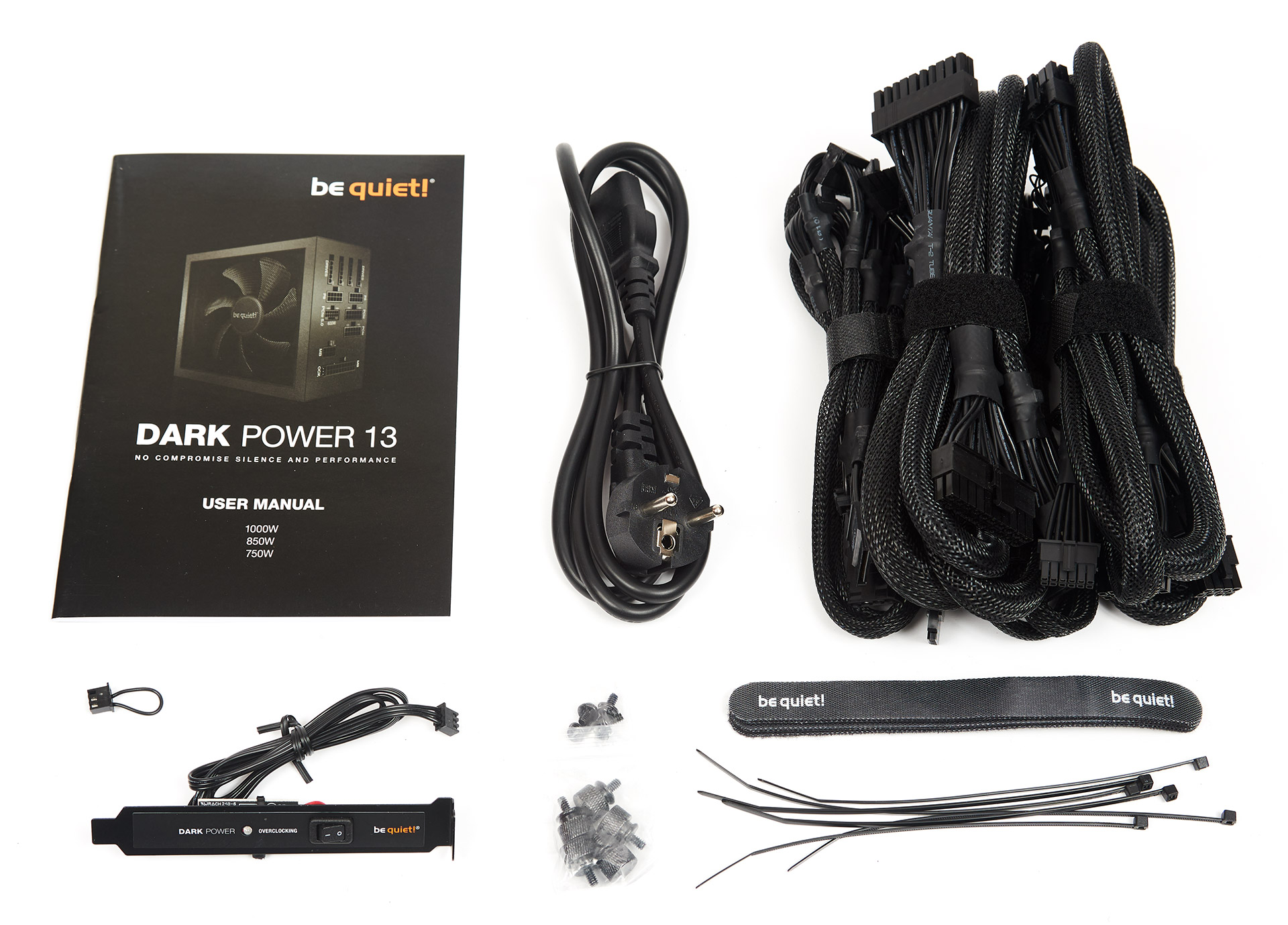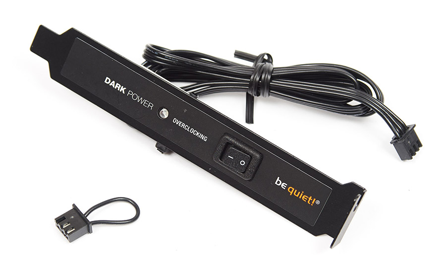 В комплект поставки входит сетевой кабель, модульные провода, два пакета с крепежом под отвертку и под ручной зажим, комплект пластиковых и тканевых кабельных стяжек, инструкция, планка Overclocking key с переключателем и индикатором, перемычка с аналогичной функцией без индикации. Переключатель Overclocking key меняет настройки системы защиты по лини +12 В, блок питания начинает выдерживать большие импульсные перегрузки без срабатывания защиты, но на максимальную мощность или обороты вентилятора он не влияет.