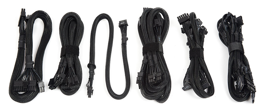 Все кабели выполнены в черной пластиковой оплетке, длина кабелей довольно большая, должно хватать для корпусов с нижним расположением блока питания.