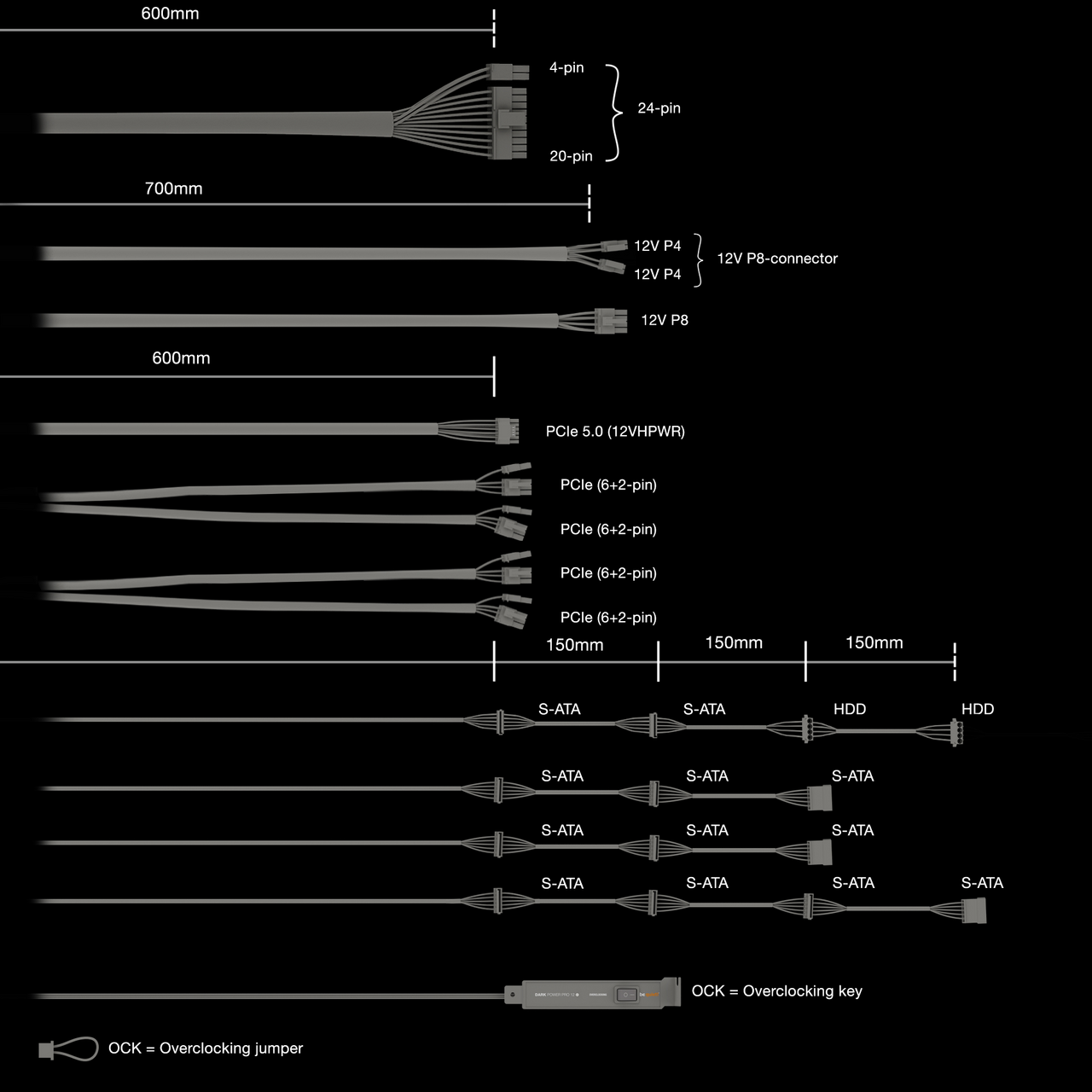 Блок питания с модульными кабелями, их количество и длина следующие: