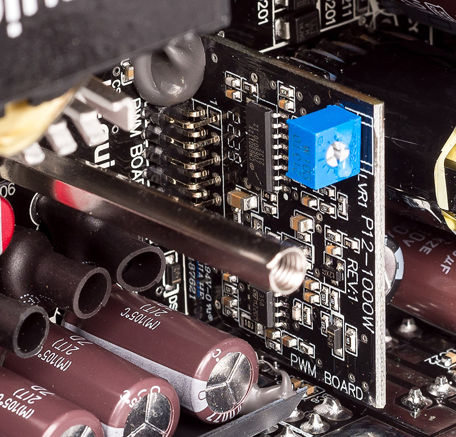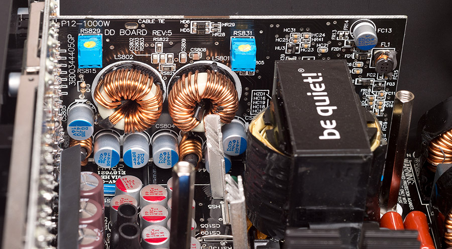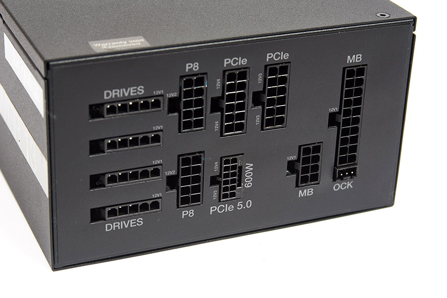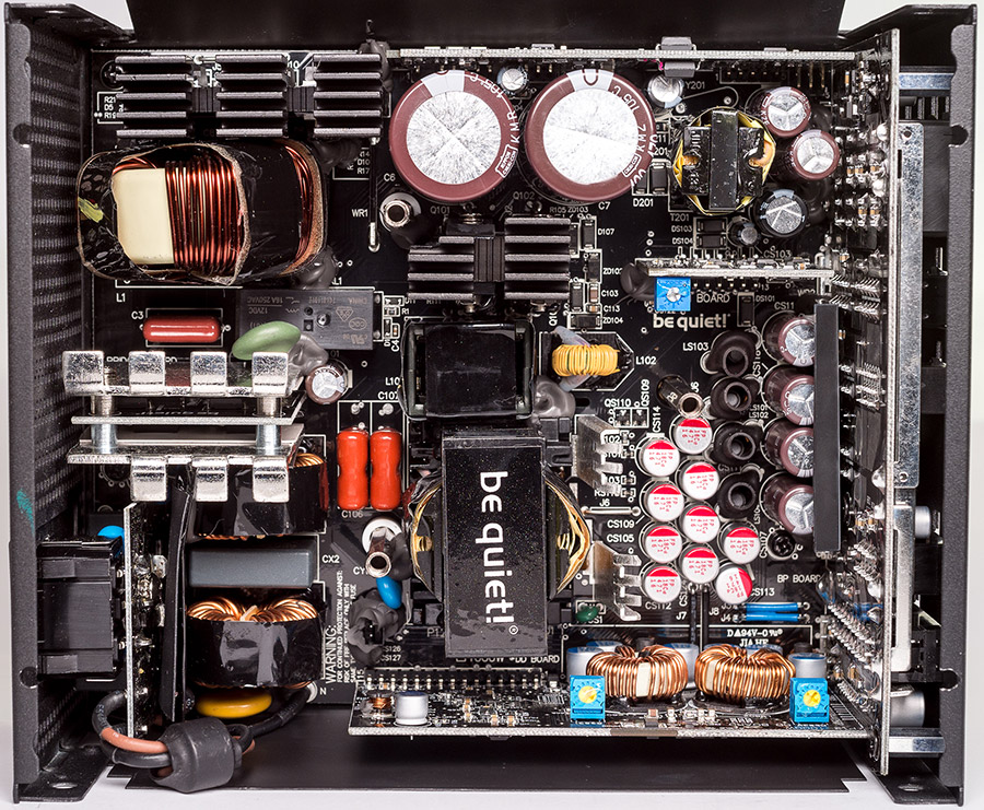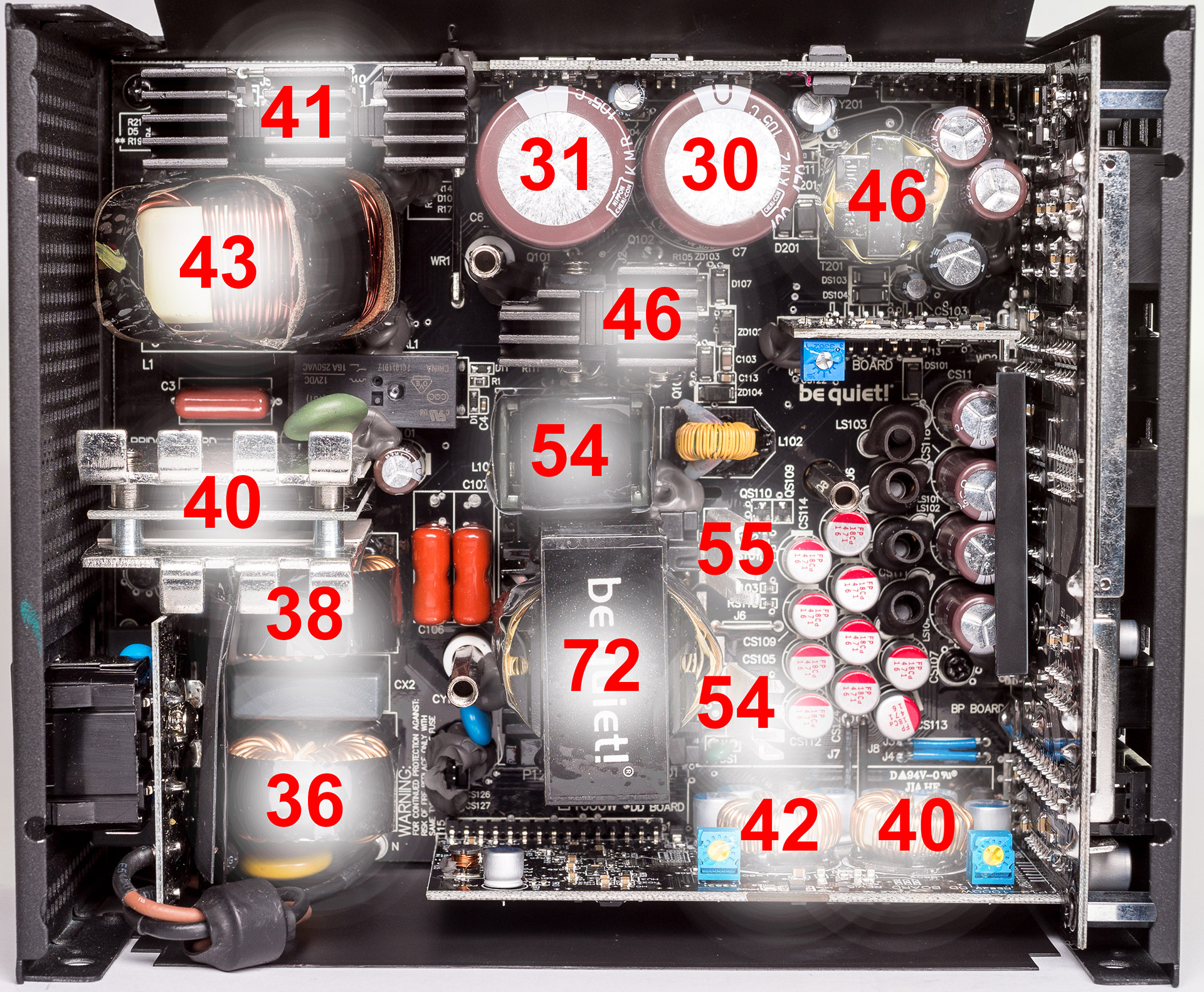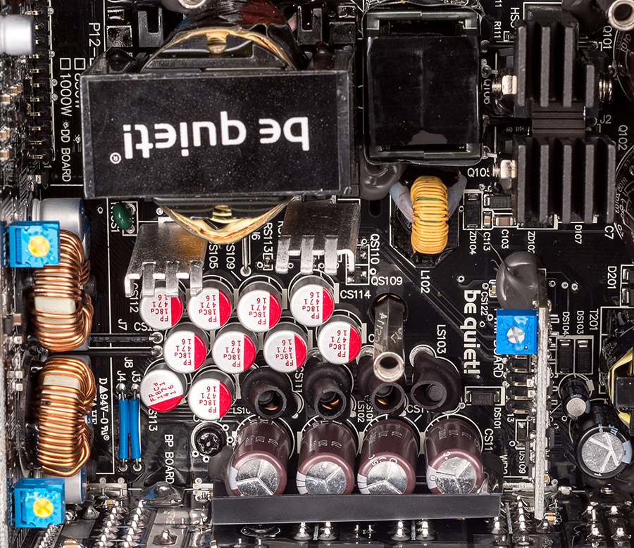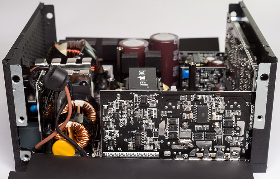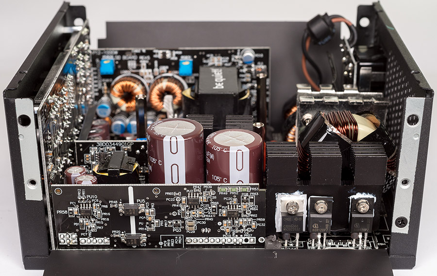 Блок построен на высокоэффективной платформе. Входной выпрямитель синхронный, используется активный корректор коэффициента мощности (APFC) с широким диапазоном входного напряжения, силовой резонансный LLC-преобразователь с синхронным выпрямителем по линии +12 В и DC/DC-преобразователи для линий +5 В и +3,3 В. Силовые платы и комплектующие такие же как и у блока Dark Power 12 850W, из нововведений только новый разъём питания видеокарт 12VHPWR. Конструкция блока нестандартная и без повреждения наклейки на тыльной стороне с модульными разъемами снять плату не получается, потому в данном обзоре не будет фото нижней стороны платы, что бы не портить внешний вид блока.