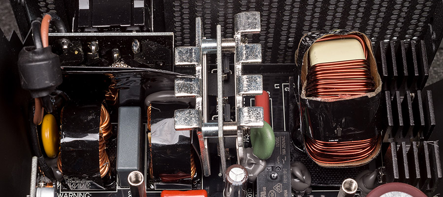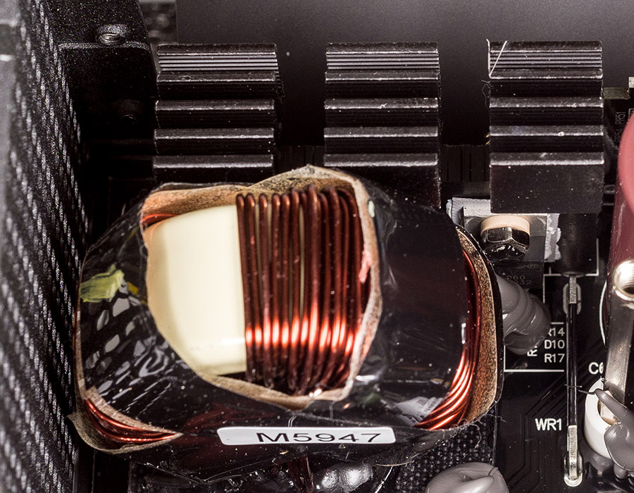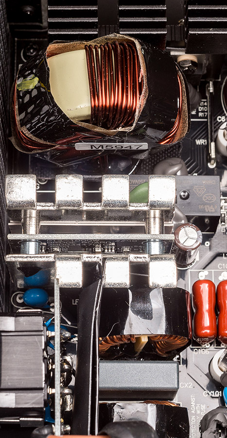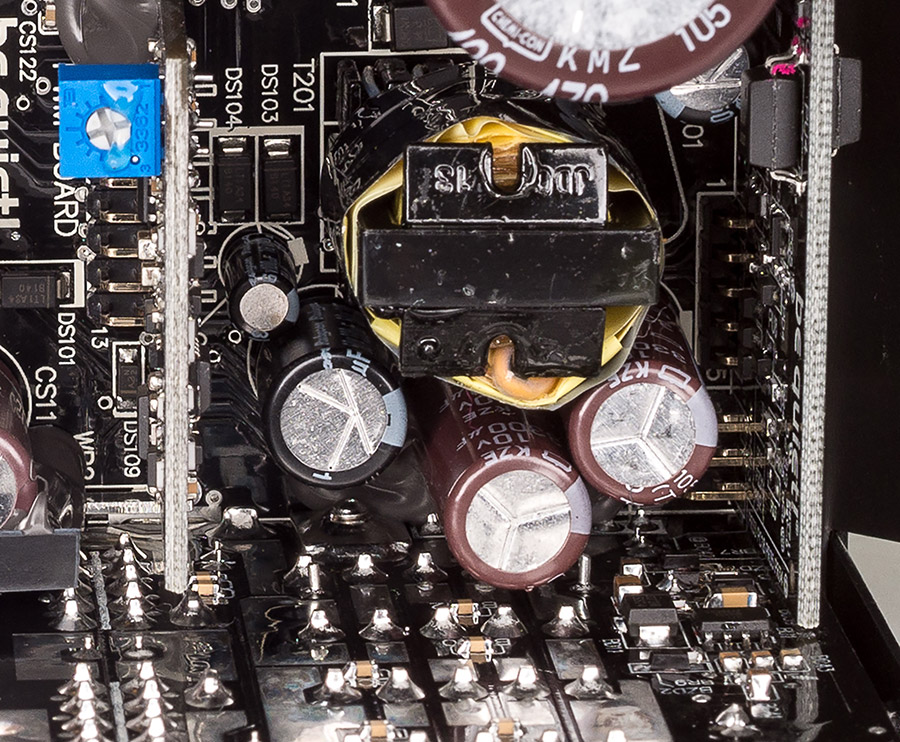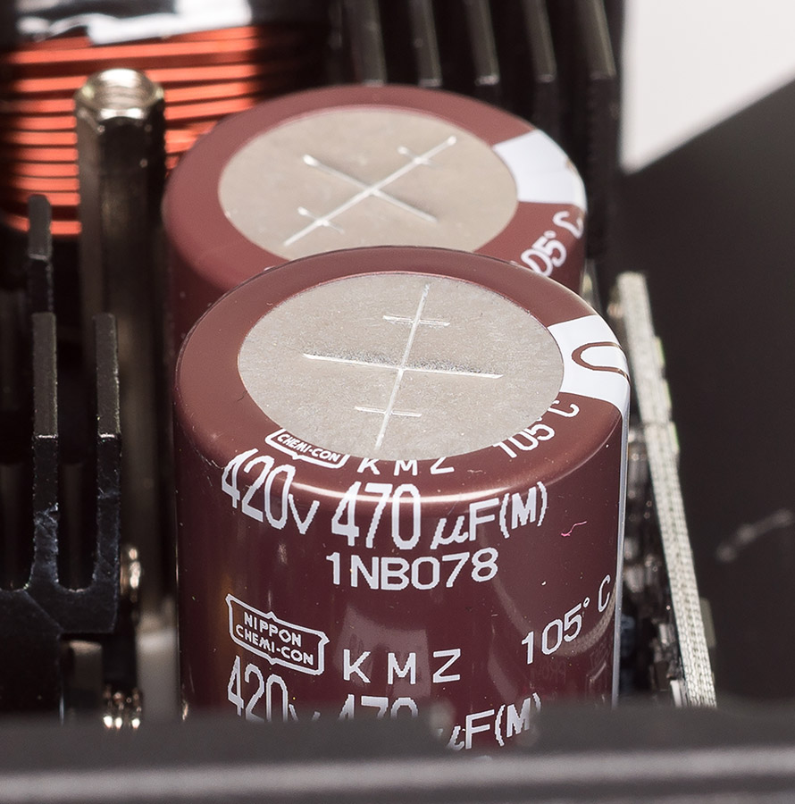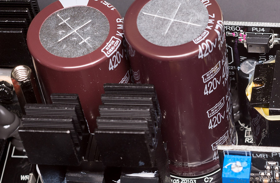 Сглаживает питание после APFC высоковольтный фильтр, состоящий из пары электролитических конденсаторов на 470 и 330 мкФ с напряжением 420 В и рабочей температурой 105°C от Nippon Chemi-Con. Общая емкость фильтра составляет 800 мкФ.