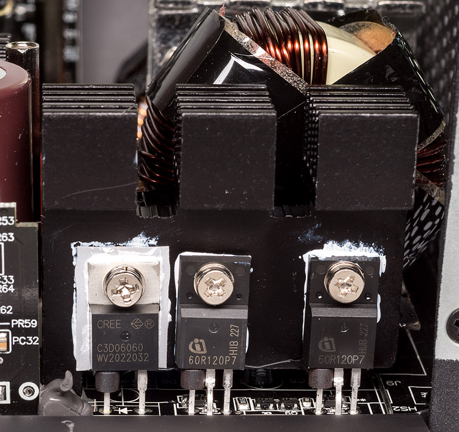 Во входной цепи распаян полноценный фильтр импульсных помех второго порядка. После фильтра установлен сетевой синхронный выпрямитель, собранный на небольшой плате. Выпрямленное напряжение сети поступает на APFC, силовые компоненты корректора установлены на отдельный радиатор, используются пара диодов C3D06060 (600 В, 19 А) и пара транзисторов IPA60R120P7 (650 В, 26 А, 0,12 Ом) включенных параллельно.