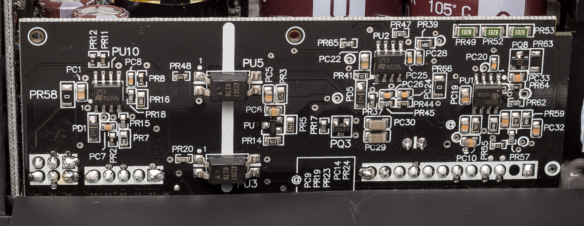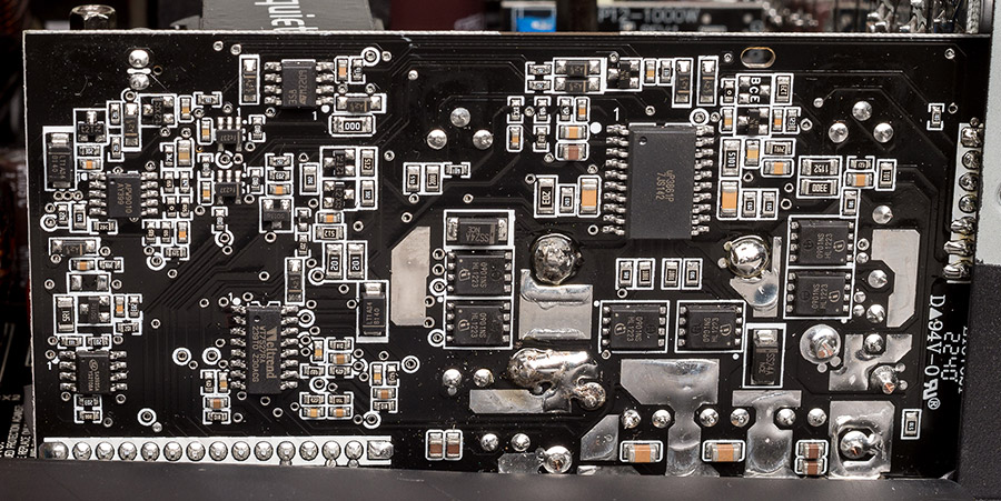 На выходе преобразователя установлен синхронный выпрямитель с обратной стороны платы, радиаторы охлаждения транзисторов можно видеть рядом с силовым трансформатором в виде двух небольших никелированных пластин. Выходное питание фильтрует десять полимерных конденсаторов емкостью 470 мкФ с рабочим напряжением 16 В и четыре электролитические Low ESR конденсаторы с параметрами 2200 мкФ 16 В на 105°C тоже от Nippon Chemi-Con. Еще на самой плате с модульными разъемами есть много полимерных конденсаторов для дополнительной фильтрации выходных напряжений.