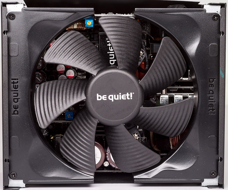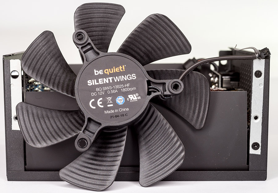 Ключевая особенность данного блока — специальный тихий бескаркасный вентилятор be quiet! Silent Wings с маркировкой BQ SIW3-13525-HF, размером 135х25 мм, максимальной скоростью 1800 об/мин и гидродинамическим подшипником. Вентилятор крепится на трех металлических стойках, пластиковые вставки по бокам закрывают внутренности блока и формируют обрамление крыльчатки. Он работает очень тихо, при включении блока вертушка стартует примерно на 350 оборотах в минуту и почти не создает шума. С увеличением мощности и нагрева компонентов скорость вентилятора увеличивается примерно до 800 оборотов в минуту, при этом оставаясь довольно тихим даже при максимальной мощности нагрузки.