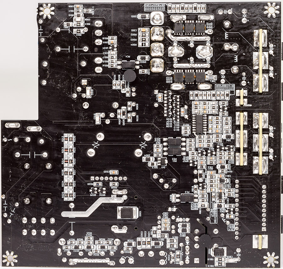 Пара силовых транзисторов резонансного LLC-преобразователя установлены на отдельный радиатор, их тип рассмотреть не удалось. Управляет преобразователем микросхема CM6901Т6X. Синхронный выпрямитель выполнен на шести транзисторах PWC012N04ES, расположенных с обратной стороны платы, которые контактируют с корпусом блока через толстую термопрокладку. Также рядом с транзисторами впаяны металлические пластины для лучшего охлаждения этой зоны платы. Выходное напряжение фильтруют шесть полимерных конденсатора емкостью 1500 мкФ и рабочим напряжением 16 В, а также четыре электролитических конденсатора емкостью 3300 мкФ (16 В, 105°C) производства Teapo. Для дополнительной фильтрации выходных напряжений на плате подключения отстегивающихся кабелей установлены еще полтора десятка полимерных и электролитических конденсаторов.