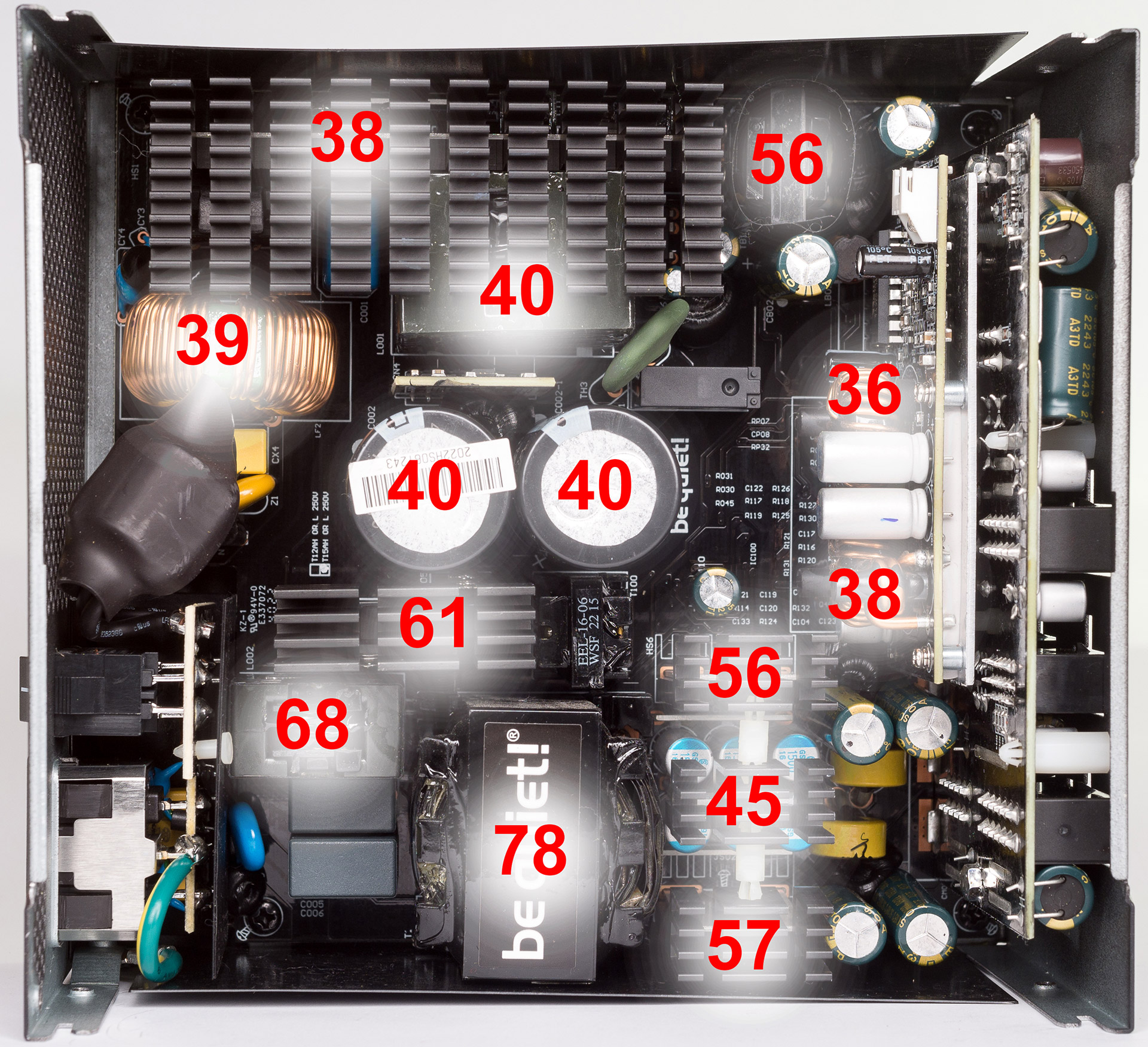 Часть элементов фильтра импульсных помех установлены на отдельной плате, припаянной к сетевому разъему, остальные элементы фильтра находятся на основной плате блока. Входной выпрямитель состоит из двух диодных сборок, включенных в параллель, одна из которых прижимается напрямую к большому общему радиатору. Дополнительно между двумя сборками вставлена пластина охлаждения. Управляет APFC контролер, установленный на отдельной небольшой плате рядом с радиатором, рассмотреть тип компонентов не удалось. В силовой части корректора установлены три транзистора NCE65TF130F (28 А, 650 В, 0,11 Ом), включенных параллельно, и диод C6D10065 (10 А, 650 В). Высоковольтный фильтр выполнен на паре электролитических конденсаторов емкостью 470 мкФ и напряжением 400 В с рабочей температурой 105°C производства фирмы Elite. Общая емкость фильтра составляет 940 мкФ.