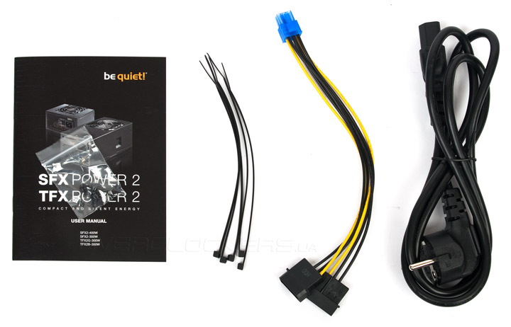 В комплекте поставки можно обнаружить инструкцию, набор нейлоновых стяжек, монтажные винты и сетевой шнур. Есть еще 20-см переходник с двух «молексов» на шестиконтактный разъем питания PCI-E.