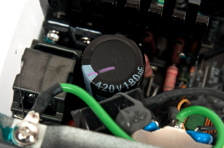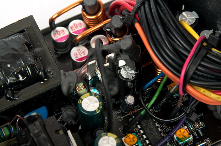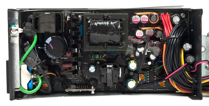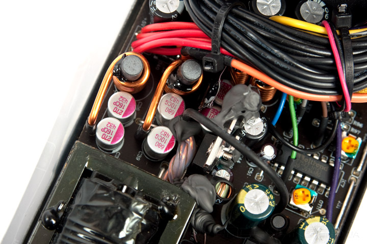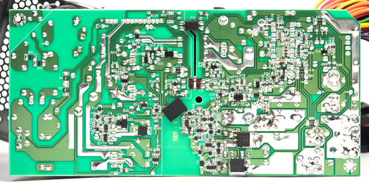 По качеству сборки особых претензий нет, заметны лишь незначительные остатки флюса на обратной стороне печатной платы. Там же распаяны транзисторы низковольтных выпрямителей. В отличие от рассмотренного ранее блока SFX Power 2 300W здесь реализованы честные виртуальные линии — одна идет сугубо для питания процессора, а вторая для всех остальных компонентов системы, т.е. к выбору видеокарты, если придется, надо подходить обдуманно.