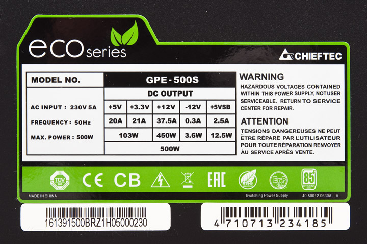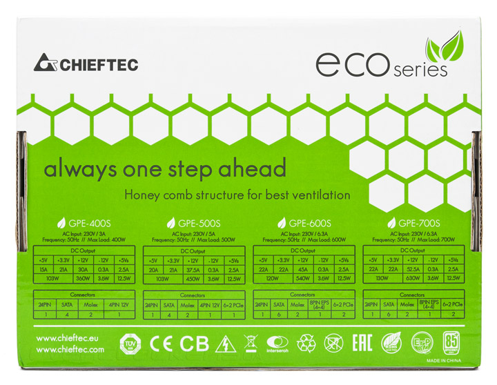 В данном обзоре мы рассмотрим одно из бюджетных решений Chieftec, относящееся к представленной недавно серии Eco, в которую входят продукты мощностью от 400 до 700 Вт. Производитель обещает высокий КПД на уровне 85% (аналог 80 Plus Bronze) для напряжения 230 В, относительно тихую работу новых устройств и поддержку энергосберегающих режимов C6 и C7 процессоров Intel.