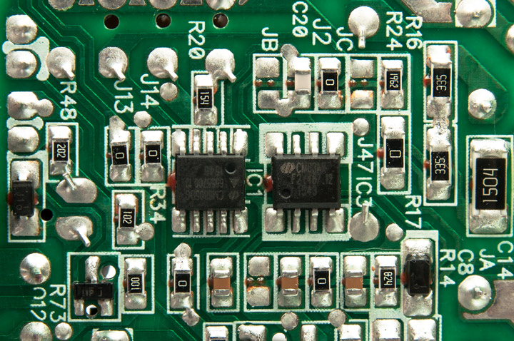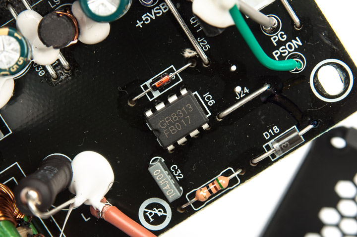 Управляется он с ключевыми транзисторами ШИМ-контроллером CM6805BG, который вместе с коммутатором CM03AX расположен на обратной стороне платы, тогда как на лицевой находится лишь чип мониторинга GR8313.