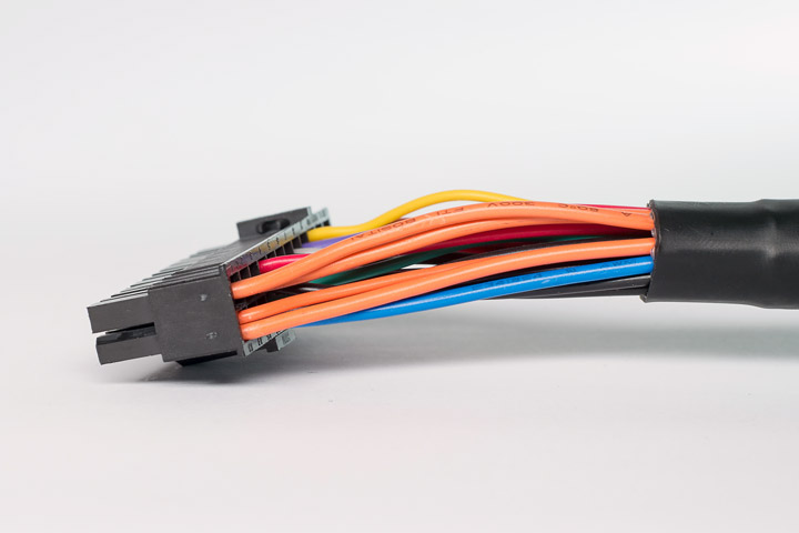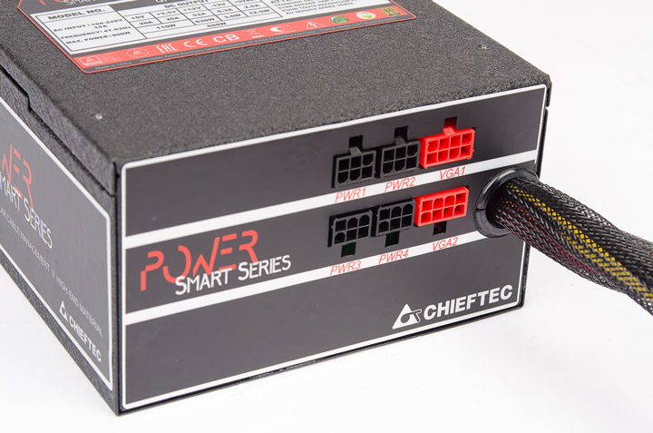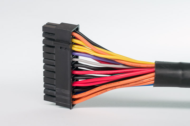 Все кабели обтянуты нейлоновой оплеткой черного цвета. Их длины должно быть достаточно для сборки системы в корпусе с нижним расположением блока питания. Коннекторы питания ATX24, CPU и PCI-E составные, но без проблем можно подключить разъём с нужным количеством контактов.