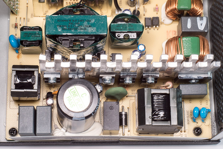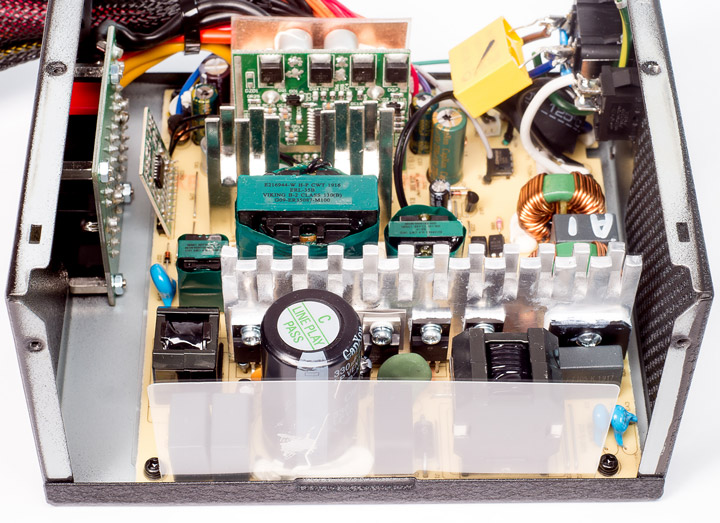 Рассматриваемая модель обладает высокой эффективностью, построена на современной платформе производства CWT, с активным PFC, который работает в широком диапазоне напряжения сети питания. Силовая часть основана на базе резонансного преобразователя с синхронным выпрямителем на выходе по линии +12 В, напряжения +5 B и +3,3 B формируются отдельными DC/DC-преобразователями, стабилизация всех основных напряжений независимая.