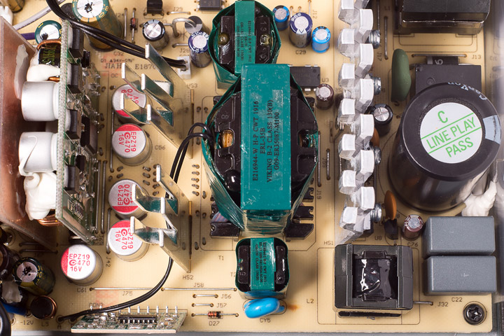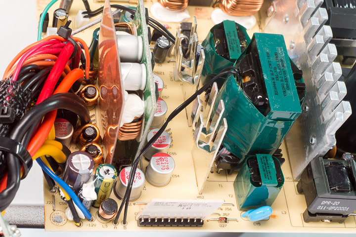 Дежурное питания +5VSB выполнено на ШИМ-контролере TNY177PN c интегрированным силовым ключом, конденсаторы обвязке контролера производства CapXon и других фирм аналогичного уровня, точные данные посмотреть проблематично из-за больших компонентов вокруг. На выходе установлен электролитический Low ESR конденсатор 2200 мкФ 10 В серии GF (5000 часов при температуре 105 °С) производства CapXon и после небольшого дросселя еще один электролитический конденсатор 1000 мкФ 16 В серии WL (5000 часов при температуре 105 °С) производства JunFu.