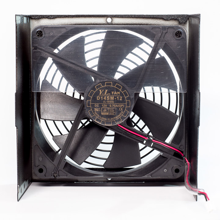За охлаждение компонентов отвечает 140-мм вентилятор D14SM-12 (12 В, 0,7 A) производства Yate Loon Electronics с номинальной частотой вращения 1400 об/мин, уровнем шума 29 дБ и двухконтактным подключением. Вентилятор управляется автоматически, при старте блока питания обороты минимальны и его почти не слышно, при прогреве компонентов синхронного выпрямителя обороты плавно увеличиваются. Полупассивного режима работы, когда вентилятор полностью отключен при температуре ниже определенного уровня, не завезли, но это даже лучше в плане долговечности — даже при слабом обдуве конденсаторы рядом с горячими компонентами прогреваются заметно меньше, чем без обдува.